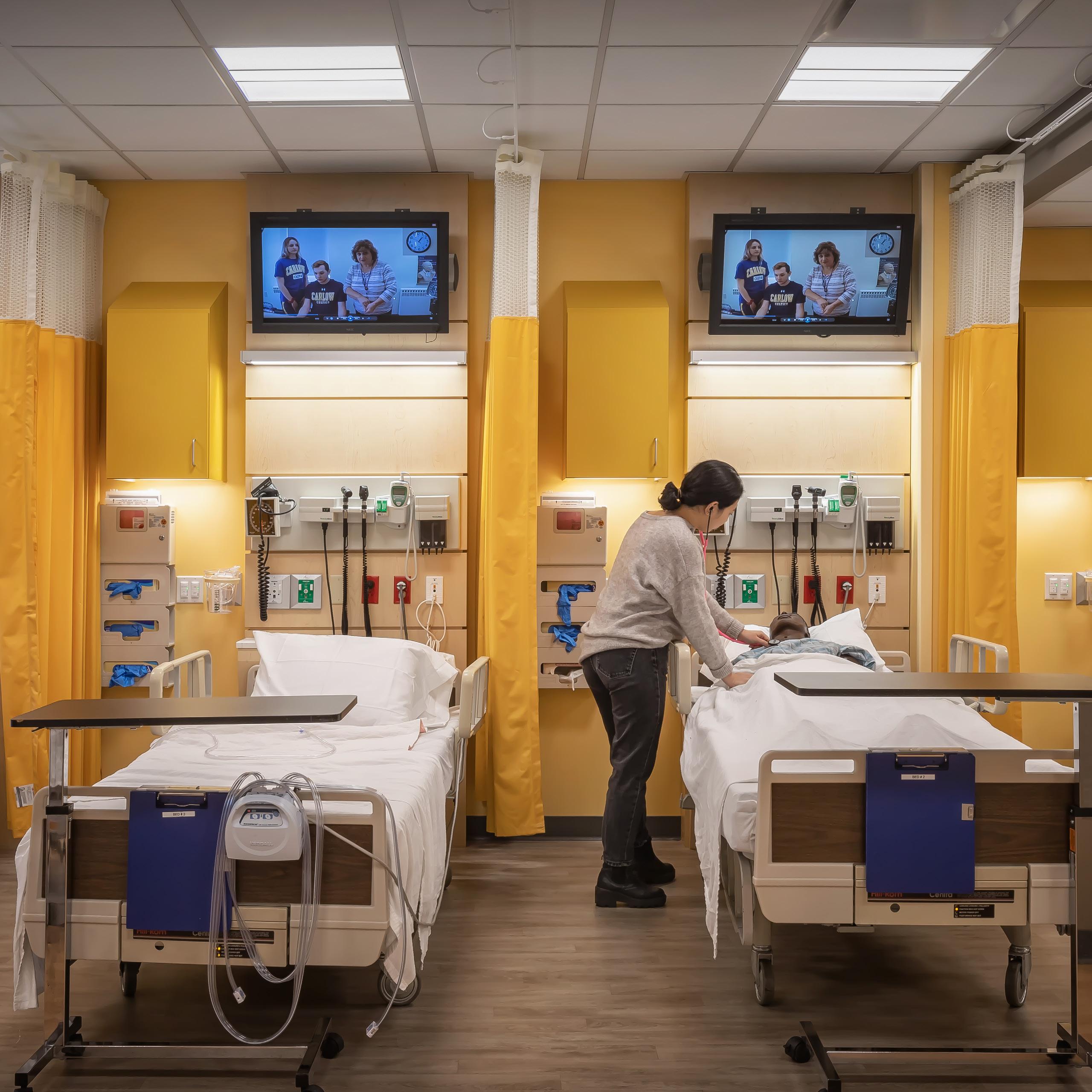 Designing educational space meant to simulate the real work environment of a healthcare operation was a unique challenge. It was critical that the sim labs look and act like hospital inpatient rooms. Students interact with robotic mannequins in these spaces. The students must be able to complete all of the typical protocols they will perform in the clinical environment. In the new sim labs, students can wash hands, interpret data on patient monitors, provide treatment, and chart data.