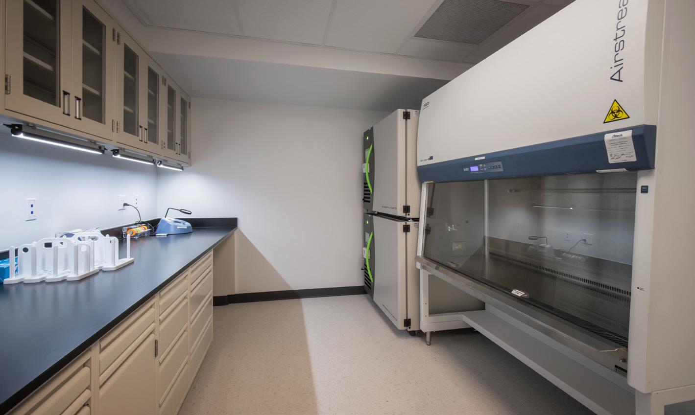 The ceiling heights in the existing warehouse facility made the project particularly challenging with the inclusion of nine Biosafety cabinets and two fume hoods. A liquid nitrogen system to support the ultralow freezers required for lab functions was also included. Careful attention was given to coordination of overhead services to allow for the required engineering of the space, while providing an open feel to the laboratories and designing for employee comfort. Extensive renovation of the space includes fume hoods, a cold room, lab gas systems, and a liquid nitrogen system.