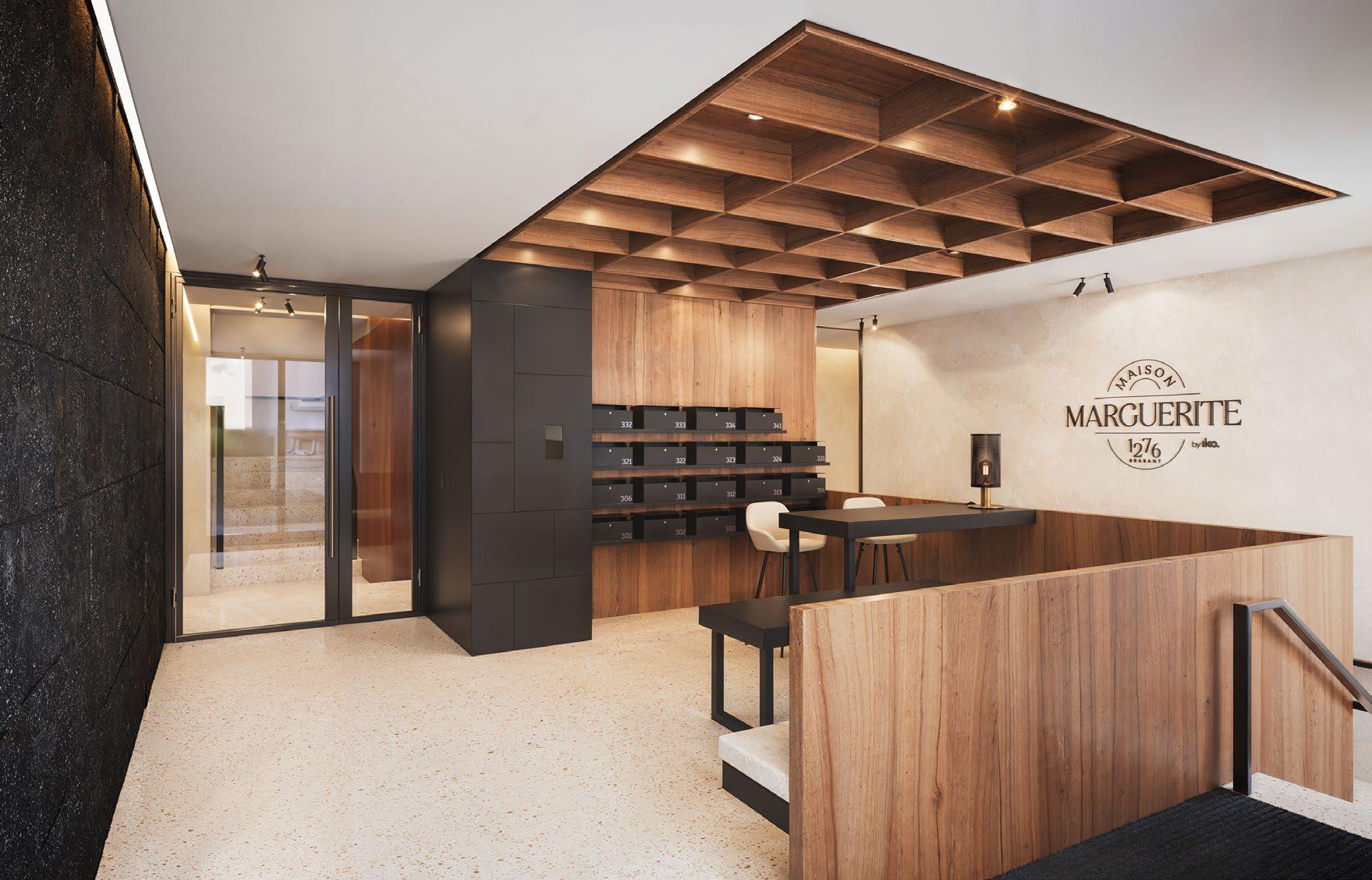 Conçu comme un véritable lobby résidentiel, le hall de Maison Marguerite traduit la philosophie Iconic by IKO : un art de l’accueil discret, mesuré et raffiné. Inspiré de l’Art Déco, il en réinterprète les codes dans une version contemporaine et apaisée.
