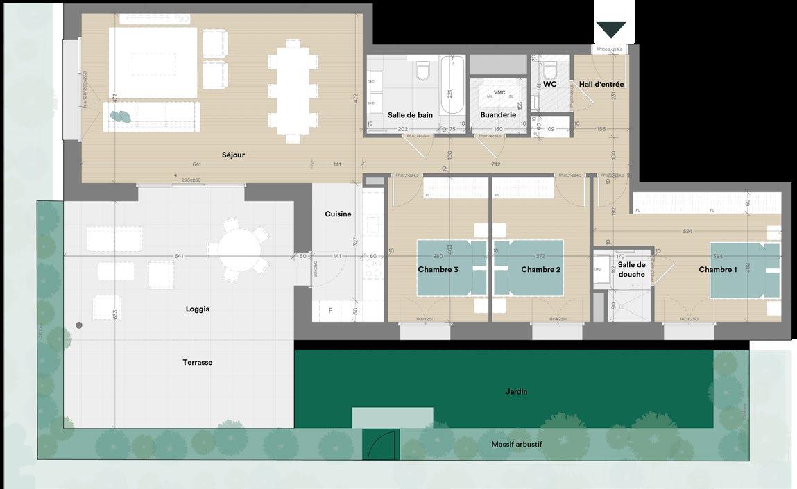Près de 111 m2 intérieurs , avec une triple exposition et de 40 m2 de surface extérieure entre loggia, terrasse et jardin. Une typologie conciliant espaces partagés et zones de repos préservées.