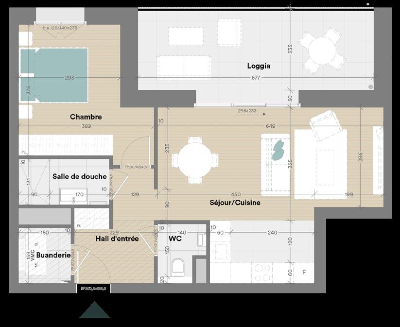 Environ 54 m² intérieurs, prolongés par une loggia de 15 m². Un cadre intime, baigné de lumière