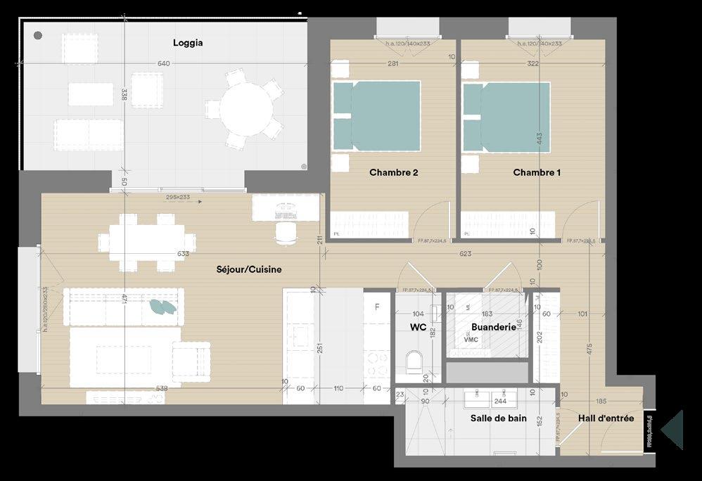 Environ 54 m² intérieurs, prolongés par une loggia de 15 m². Un cadre intime, baigné de lumière