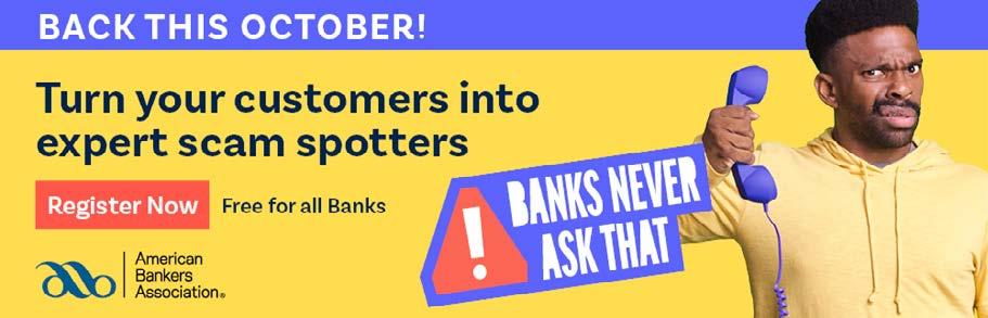 Registration is open now for our 2022 campaign—which kicks off on October 3! ABA will be making fresh and fun updates to BanksNeverAskThat.com and adding new content to the easy-to-use toolkit. Look for videos, animated graphics, digital signage, and more— free for ALL banks, courtesy of ABA.