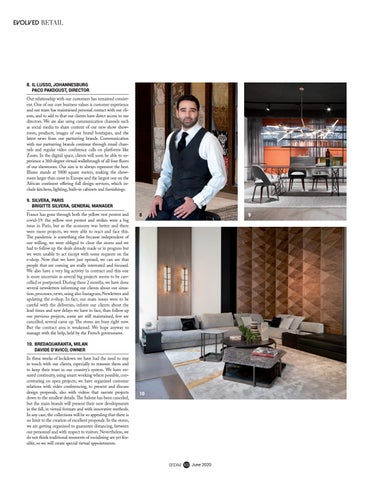 8. IL LUSSO, JOHANNESBURG PACO PAKDOUST, DIRECTOR Our relationship with our customers has remained consistent. One of our core business values is customer experience and our team has maintained personal contact with our clients, and to add to that our clients have direct access to our directors. We are also using communication channels such as social media to share content of our new show showroom, products, images of our brand boutiques, and the latest news from our partnering brands. Communication with our partnering brands continue through email channels and regular video conference calls on platforms like Zoom. In the digital space, clients will soon be able to experience a 360-degree virtual walkthrough of all four floors of our showroom. Our aim is to always represent the best. Illusso stands at 5000 square meters, making the showroom larger than most in Europe and the largest one on the African continent offering full design services, which include kitchens, lighting, built-in cabinets and furnishings. 9. SILVERA, PARIS BRIGITTE SILVERA, GENERAL MANAGER France has gone through both the yellow vest protest and covid-19: the yellow vest protest and strikes were a big issue in Paris, but as the economy was better and there were more projects, we were able to react and face this. The pandemic is something else because independent of our willing, we were obliged to close the stores and we had to follow up the deals already made or in progress but we were unable to act except with some requests on the e-shop. Now that we have just opened, we can see that people that are coming are really interested and focused. We also have a very big activity in contract and this one is more uncertain as several big projects seems to be cancelled or postponed. During these 2 months, we have done several newsletters informing our clients about our situation, processes, news, using also Instagram, Newletters and updating the e-shop. In fact, our main issues were to be careful with the deliveries, inform our clients about the lead times and new delays we have to face, than follow up our previous projects, some are still maintained, few are cancelled, several came up. The stores are busy right now. But the contract area is weakened. We hope anyway to manage with the help, held by the French government.