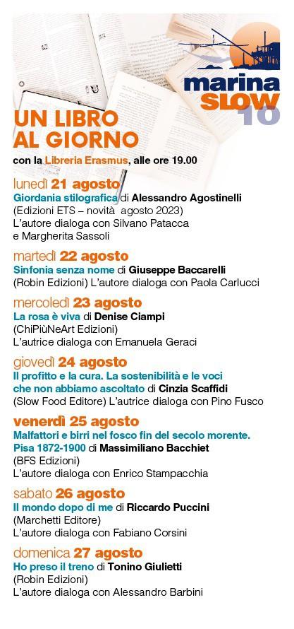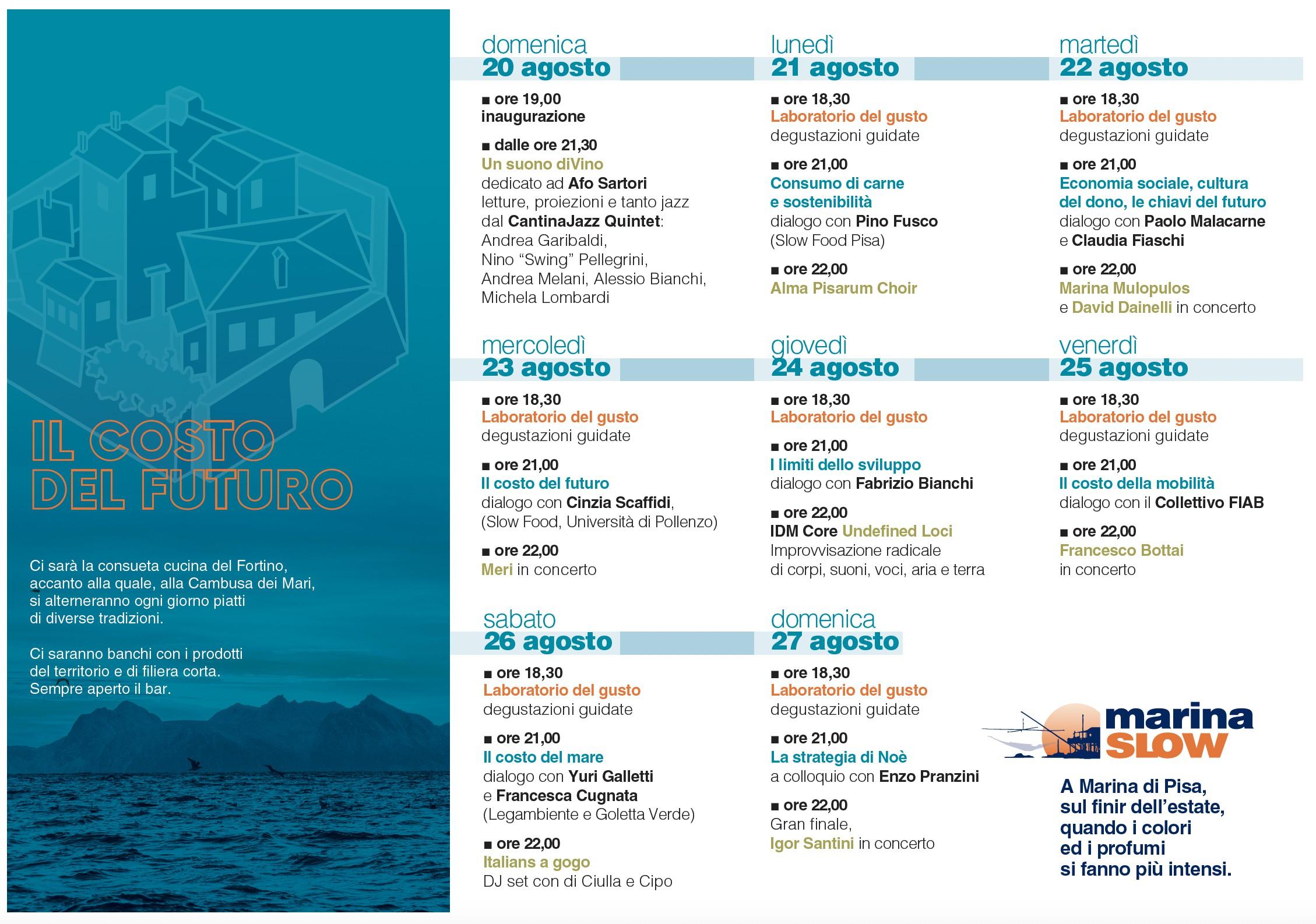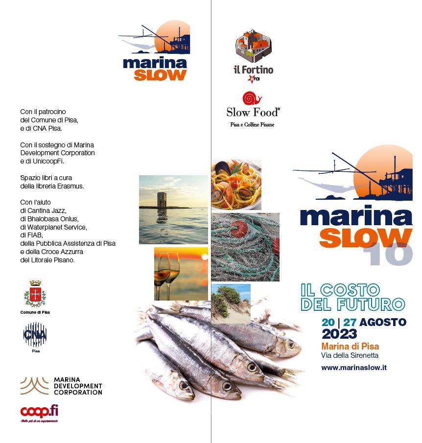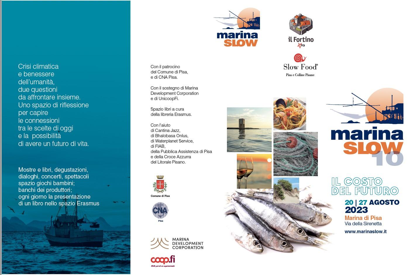 Marina Slow nasce nel 2012, inventata da due sognatori: Giuliano Meini, allora “fiduciario” della condotta Slow Food, e Fabiano Corsini, animatore del Circolo Il Fortino, lo storico circolo del Cantiere di Marina di Pisa . L'idea è quella di mettere in campo una proposta diversa da quella del baccano propinato ai turisti mordi e fuggi: mescolare la gioia della festa e dell'arte con quella del buon cibo, del pesce povero in particolare. Marina Slow è organizzata dal Circolo il Fortino, Associazione di Promozione Sociale, e dalla Condotta Slow Food Pisa e Colline Pisane Pisane.