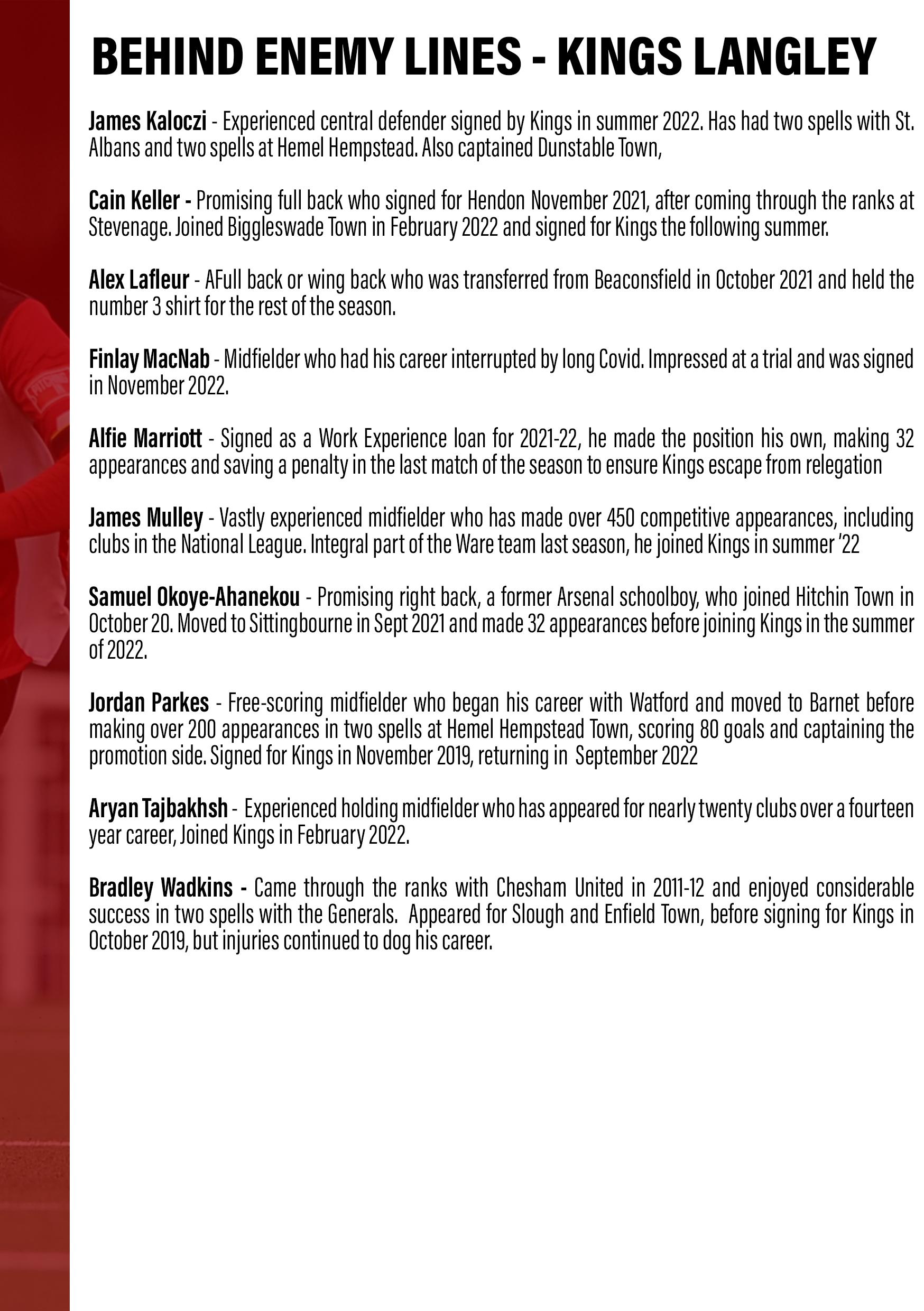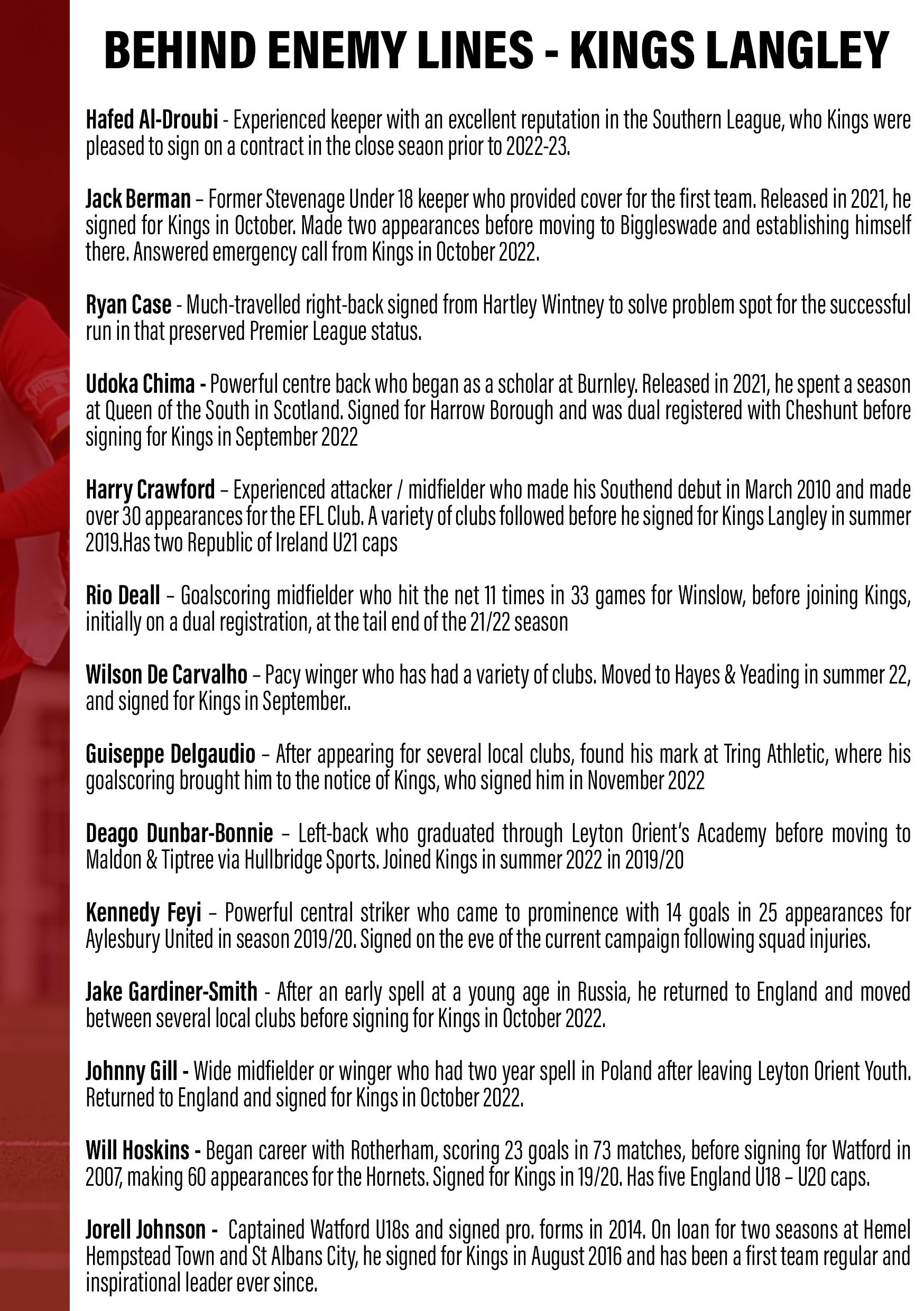 Date Comp v Opposition KO Att Res Pos 1 2 3 4 5 6 06.08.22 SLCP A Tamworth 3:00pm 667 1-1 11th Deeney Bird s Wakefield Thomas K 1 Brown-Hill Fenton 13.08.22 SLCP H Leiston 3:00pm 668 2-2 13th Deeney Thomas K Brown-Hill Troke Daly Fenton 15.08.22 SLCP A Barwell 7:45pm 455 1-2 15th Deeney Bennett O’Hanlon Bird Turner s Fenton 20.08.22 SLCP H Redditch United 3:00pm 639 1-1 17th Deeney Thomas K O’Hanlon Troke Daly Fenton 27.08.22 SLCP A Rushden &Diamonds 3:00pm 362 1-1 18th Deeney Thomas K Bennett Eratt-Thompson Willock Fenton 29.08.22 SLCP H Mickleover 3:00pm 882 2-3 19th Deeney Thomas K s Bennett Bird s Willock 1 Fenton 03.09.22 FAC1q A Matlock Town 3:00pm 695 2-0 19th Deeney Wilson J Brown-Hill Solanke Willock Fenton 13.09.22 SLCP A Coalville Town 7:45pm 574 4-1 18th Deeney Wilson J O’Hanlon Solanke s Willock Fenton 17.09.22 FAC2q A Anstey Nomads 3:00pm 602 1-1 18th Deeney Wilson J Bennett Solanke s Willock Fenton 20.09.22 FAC2q H Anstey Nomads 7:45pm 561 3-3* 18th Deeney Wilson J 1 Bennett s Thomas Willock Fenton 24.09.22 SLCP A Bedford Town 3:00pm 540 2-2 17th Deeney Wilson J Hutchinson Thomas Willock Fenton 27.09.22 SLCP H Stratford Town 7:45pm 522 2-1 15th Battersby Wilson J Hutchinson Thomas Willock Fenton 04.10.22 SLCP H St Ives Town 7:45pm 442 2-3 15th Battersby Wilson J s Hutchinson Thomas s Willock Fenton 08.10.22 FAT2q A Coalville Town 3:00pm 485 1-4 15th Battersby Hilton Hutchinson Thomas Willock Fenton s 11.10.22 SLCP A Rushall Olympic 7:45pm 253 0-2 15th Battersby Wilson J Hutchinson Thomas Willock Delap 15.10.22 SLCP A Royston Town 3:00pm 419 2-1 13th Battersby Wilson J Hutchinson Thomas Delap Fenton 1 22.10.22 SLCP H Bromgrove Sporting 3:00pm 704 3-1 10th Battersby Wilson J Hutchinson Thomas Delap Fenton 25.10.22 SLCP H Stourbridge 7:45pm 513 0-2 12th Battersby Wilson J Hutchinson Thomas Delap Fenton 05.11.11 SLCP H Hitchin Town 3:00pm 607 3-1 8th Battersby Wilson J Hutchinson Thomas Bradley Fenton 1 12.11.22 SLCP A Nuneaton Borough 3:00pm 610 0-2 12th Battersby Wilson J Wilder Thomas Bradley Fenton 19.11.22 SLCP H Barwell 3:00pm 522 2-0 10th Battersby Wilson J Wilder Eratt-Thompson1 Bradley Fenton 26.11.22 SLCP H King’s Langley 3:00pm 03.12.22 SLCP A Redditch United 12:30pm 10.12.22 SLCP H Tamworth 3:00pm 17.12.22 SLCP A Alvechurch 3:00pm 26.12.22 SLCP H Basford United 3:00pm 02.01.23 SLCP A Mickleover 3:00pm 07.01.23 SLCP H Rushden &Diamonds 3:00pm 14.01.23 SLCP A King’s Langley 3:00pm 21.01.23 SLCP A St Ives Town 3:00pm 28.01.23 SLCP H Coalville Town 3:00pm 04.02.23 SLCP A Stratford Town 3:00pm 11.02.23 SLCP H Bedford Town 3:00pm 18.02.23 SLCP A Needham Market 3:00pm 25.02.23 SLCP H Rushall Olympic 3:00pm 04.03.23 SLCP A Bromgrove Sporting 3:00pm 11.03.23 SLCP H Needham Market 4:00pm 18.03.23 SLCP H Royston Town 3:00pm 25.03.23 SLCP A Stourbridge 3:00pm 01.04.23 SLCP H Alvechurch 3:00pm 08.04.23 SLCP H Hednesford Town 3:00pm 10.04.23 SLCP A Basford United 3:00pm 15.04.23 SLCP H Nuneaton Borough 3:00pm 22.04.23 SLCP A Hitchin Town 3:00pm