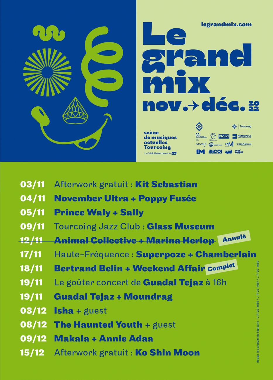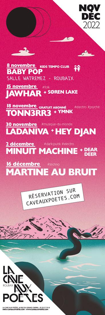 MARDI 15 NOVEMBRE JAWHAR, SØREN LAKE VENDREDI 18 NOVEMBRE TONN3RR3, YMNK MERCREDI 30 NOVEMBRE HEY DJAN, LADANIVA VENDREDI 2 DÉCEMBRE MINUIT MACHINE, DEAR DEER