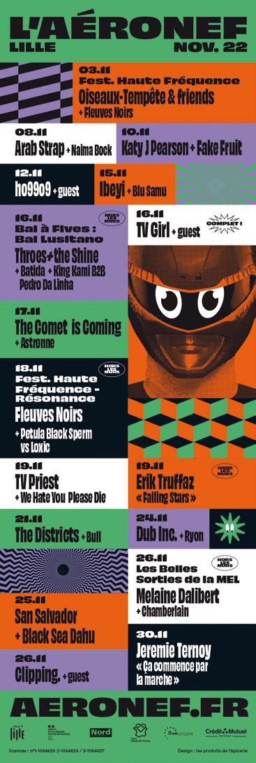 Gros programme pour ce mois de novembre, et que du bon pour la salle qui devient, ou redevient la référence des rendez-vous de la scène indépendante, tous styles confondus. Et là j’avoue un coup de cœur sous forme d’un come-back to 90’s avec les Écossais d’ARAB STRAP. Entre pop et électro hyp notique le duo sort son septième album, As Days Get Dark, une vraie réussite. Venus de San Diego, très inspirés par les chansons françaises des années 60 et tournés vers une vision alternative de la musique, TV GIRL a su très vite trouver un public, leur nouvel album, Summer’s Over, en est un bel exemple. ERIk TRUFFAZ, son nom peut inspirer énormément de monde tant son parcours est prolifique et multiculturel. Trompettiste de jazz, il a exploré bien des sentiers. Ce concert est à l’invitation de l’Or chestre Nationale de Lille et promet d’être