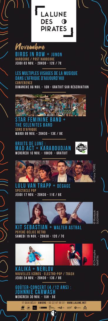 Petite par la taille (250 places) mais grande par sa no toriété, la LUNE DES PiRATES nous propose encore ce mois-ci une bien belle affiche. Commençons par le STAR FEMININE BAND, dans le cadre du festival Haute Fréquence. Ce groupe d’afro beat garage, composé de sept femmes originaires du Bénin, nous parle de l’excision, de la maltraitance et des violences faites aux filles et nous clament, haut et fort : « Nous voulons inscrire ces sujets dans le débat politique au Bénin, puis ailleurs en Afrique si cela nous est un jour possible ».