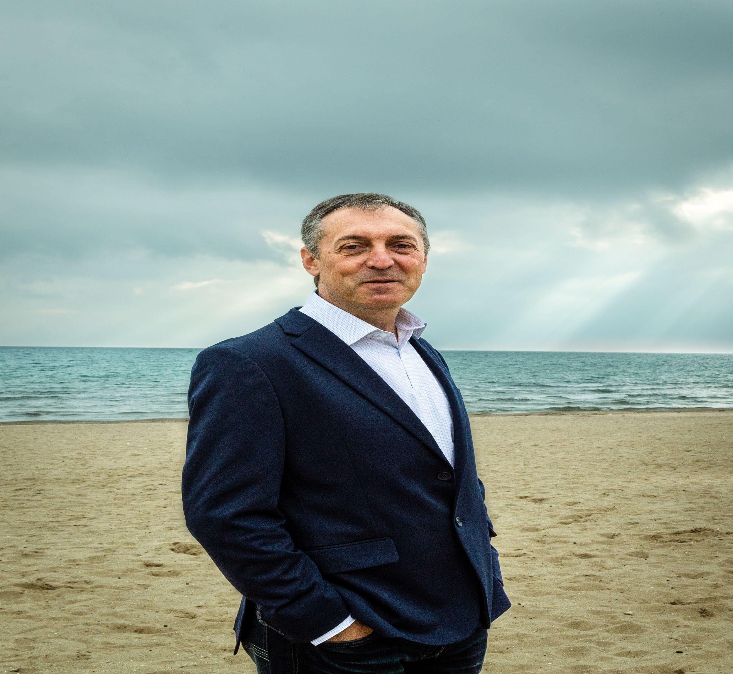 Professor Igor Cialenco is photographed standing next to Lake Michigan in Chicago.