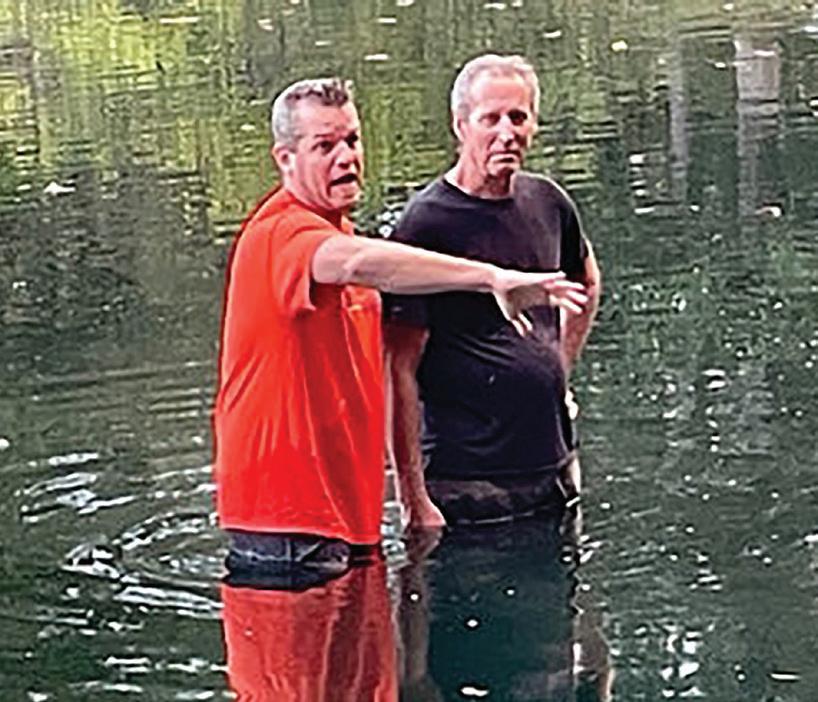 THEN AND NOW – Sandy Wisdom-Martin and her brother, Doug, as children in the top photo are joined by their sister, Pam (lower left), for Doug’s baptism at Lake Sallateeska Baptist Camp in 2021. Pastor Danny Donato (left in top photo) performed the baptism. Photos from BP