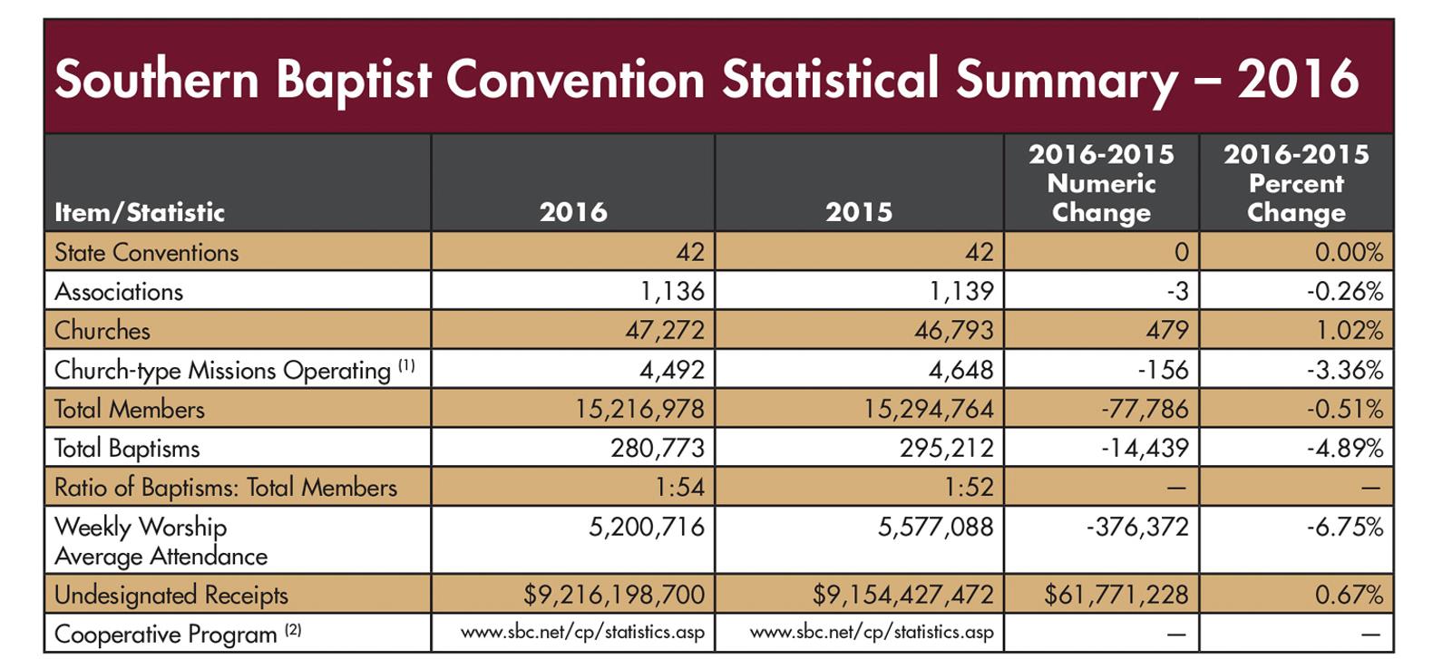 2016 reports show baptisms and worship attendance decline nationwide. There are 15.2 million of us.