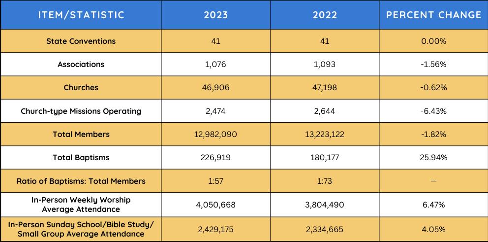 Membership, however, sank to 12,982,090 in the official tally, a drop of 1.82% from 13,223,122 in 2022. The denomination also lost 292 churches, falling below 47,000. Multi-site churches, however, increased to 680, an increase of 95 congregations.