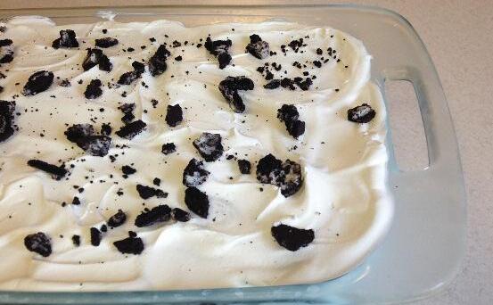 To prepare: Dip Oreos one at a time in milk, and place in bottom of a 9 x 13 baking dish Layer with one tub whipped topping Complete steps twice more, so that there are three layers each of cookies and Cool Whip Drizzle with chocolate sauce or crumbled cookies Cover and chill for at least six hours before serving Most