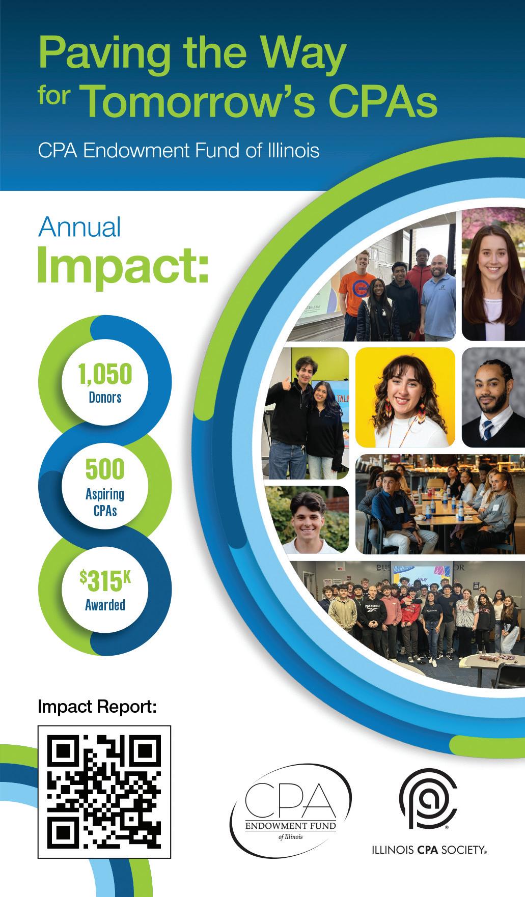 Insight is the magazine of the Illinois CPA Society. Statements or articles of opinion appearing in Insight are not necessarily the views of the Illinois CPA Society. The materials and information contained within Insight are offered as information only and not as practice, financial, accounting, legal or other professional advice. Readers are strongly encouraged to consult with an appropriate professional advisor before acting on the information contained in this publication. It is Insight’s policy not to knowingly accept advertising that discriminates on the basis of race, religion, sex, age or origin. The Illinois CPA Society reserves the right to reject paid advertising that does not meet Insight’s qualifications or that may detract from its professional and ethical standards. The Illinois CPA Society does not necessarily endorse the non-Society resources, services or products that may appear or be referenced within Insight, and makes no representation or warranties about the products or services they may provide or their accuracy or claims. The Illinois CPA Society does not guarantee delivery dates for Insight. The Society disclaims all warranties, express or implied, and assumes no responsibility whatsoever for damages incurred as a result of delays in delivering Insight. Insight (ISSN1053-8542) is published four times a year, in spring, summer, fall, and winter, by the Illinois CPA Society,