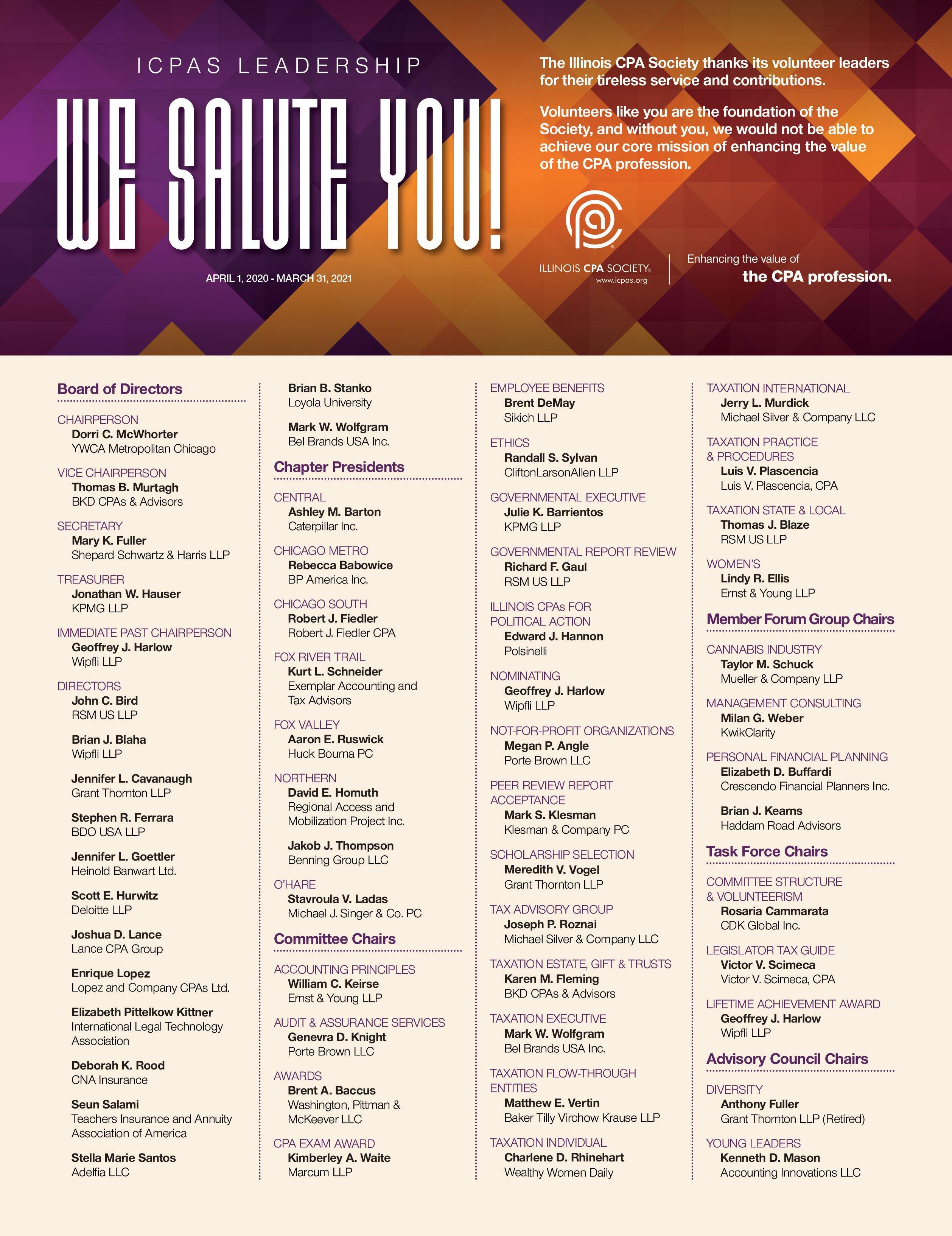 CPAs & Advisors in Chicago She is an active ICPAS member, serving on the Diversity Advisory Council Committee, State and Local Tax Committee, and Tax Executive Committee