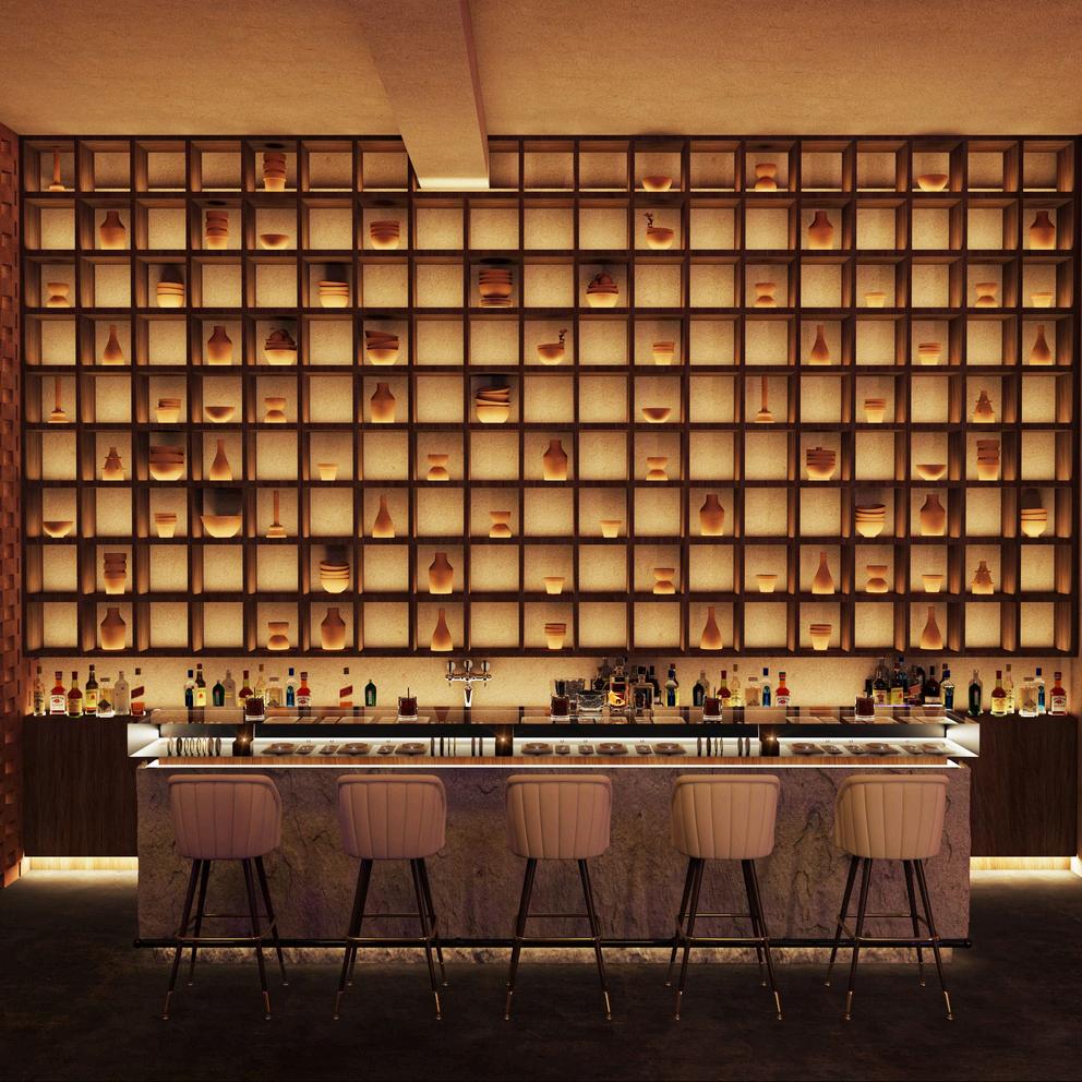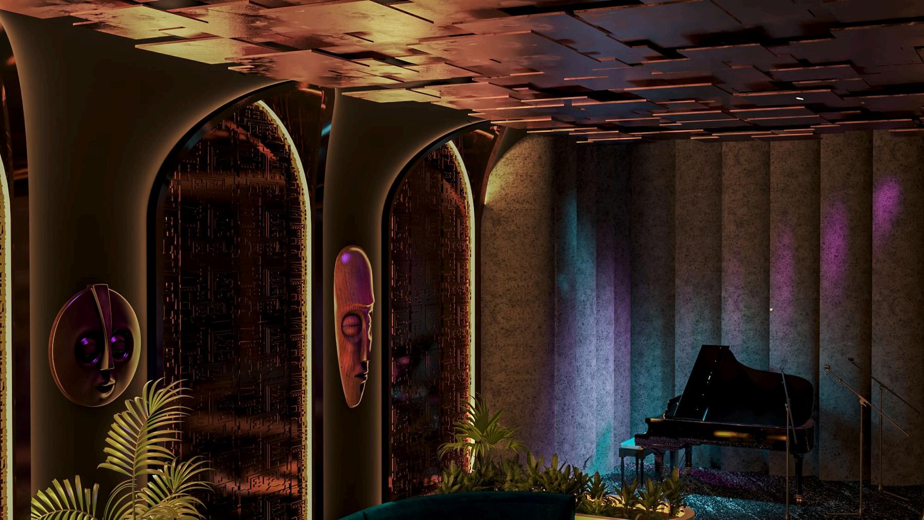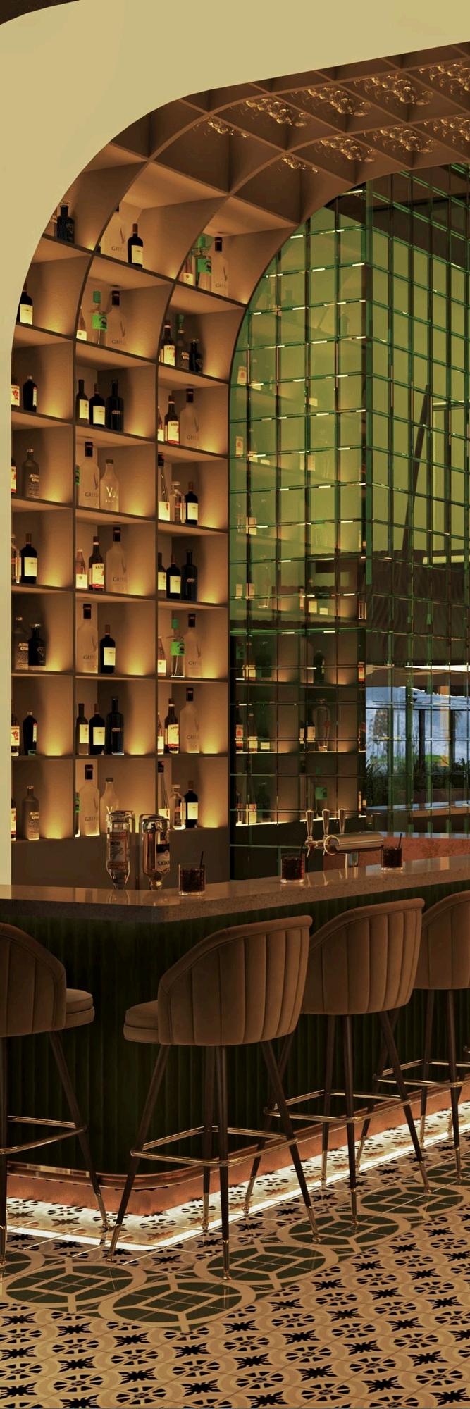 El uso de tonos cálidos y dorados y patrones intrincados rinde homenaje a las opulentas tradiciones de las culturas morisca y de Oriente Medio, donde la luz y las sombras desempeñaron un papel fundamental en la expresión arquitectónica.