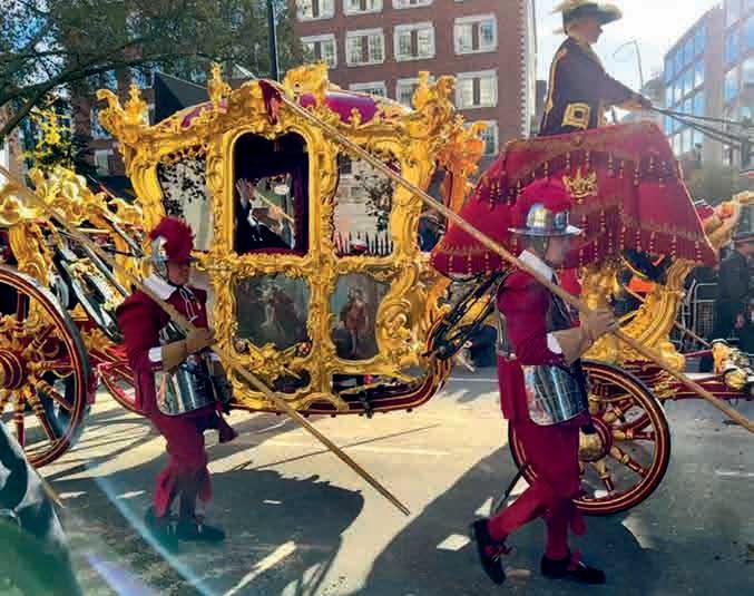 The Band of the Household Cavalry ride in their Gold State coats for the Lord Mayor. This singular honour dates ac o er ears to t e Coronation of Charles II.