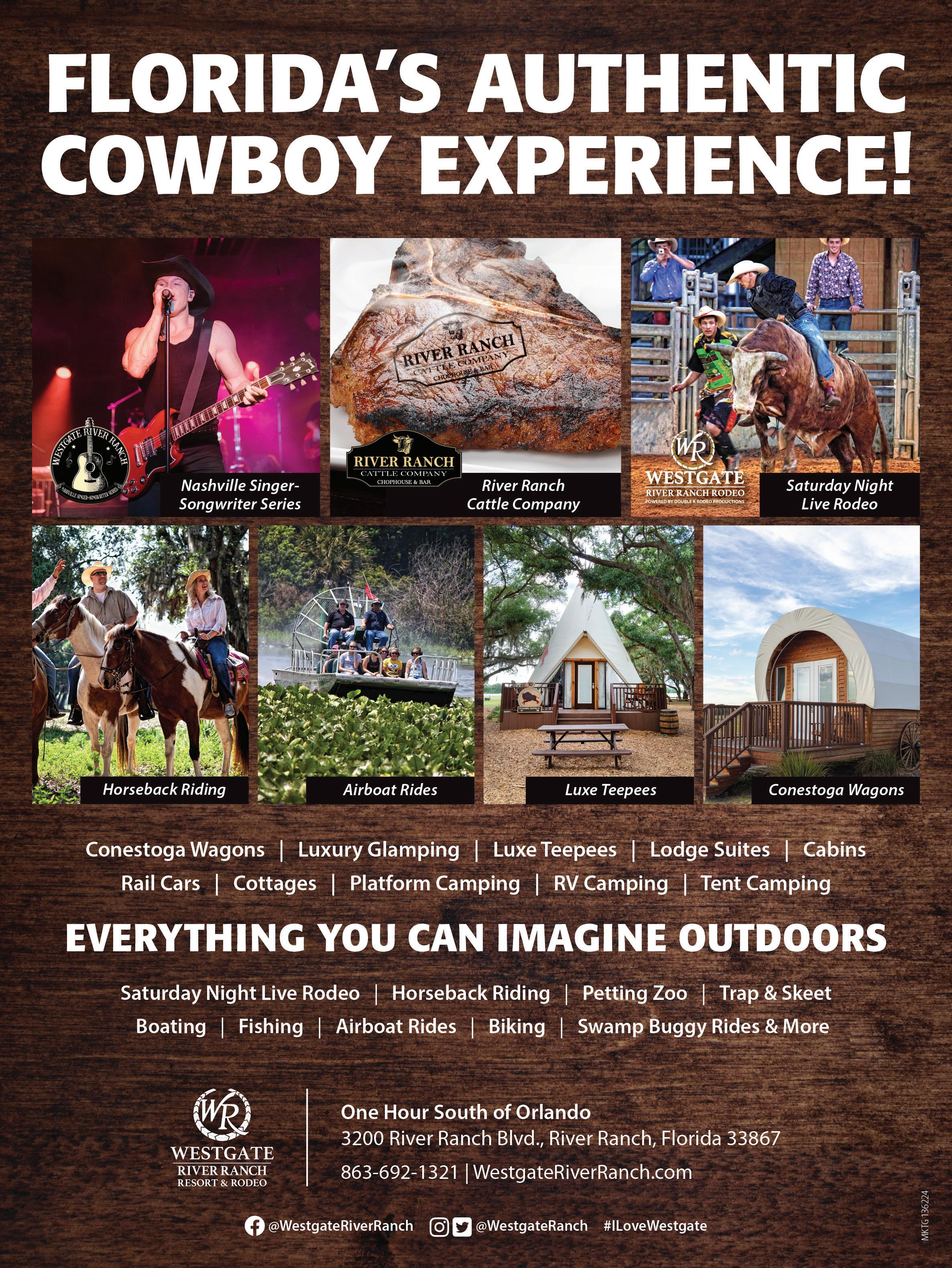 Just a short drive from the Orlando area, you’ll find a beautiful resort nestled on 1,700 acres of untouched Florida wilderness. Westgate River Ranch Resort & Rodeo offers Guests a unique vacation experience by providing both the authenticity of a Florida Ranch and the luxury of gorgeous cabin-style villas. Want to enjoy the natural beauty of our resort without actually “roughing" it? Glamping (glamorous camping) is the perfect way to experience the great outdoors, but with the amenities of a resort. If you're ready to take it to the next level, you can rent a Luxe Teepee. Each Luxe Teepee is themed in authentic Native American style and comes fully furnished with private bathrooms, air-conditioning, a fireplace and more. For a truly extraordinary vacation, the Luxe Conestoga Wagons are the way to go! Step into your very own wagon and experience a world of luxury with upscale interiors while still being one with nature. Experience the great outdoors without missing the essential comforts of home.