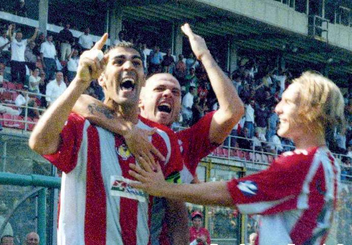 Prisciandaro festeggiato dopo il gol al Catanzaro nel 2005 (foto Ivano Frittoli)