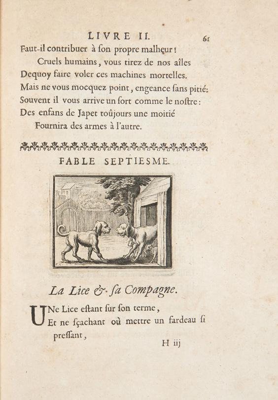 4to (245 x 182 mm). Armoiries du dédicataire sur la page de titre, 118 vignettes calcographiques au début des fables signées F.C. (François Chauveau), en-têtes, lettrines et culs-de-lampe gravés sur bois (trace d’un offset d’impression sur la page de titre, traces sporadiques de poussière, quelques légères taches et rousseurs, légèrement