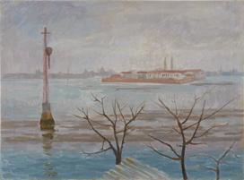 acquerello su carta (cm 25x17) monogrammato in basso a sinistra titolato in basso a destra al retro: tracce di cartiglio in cornice (difetti)
