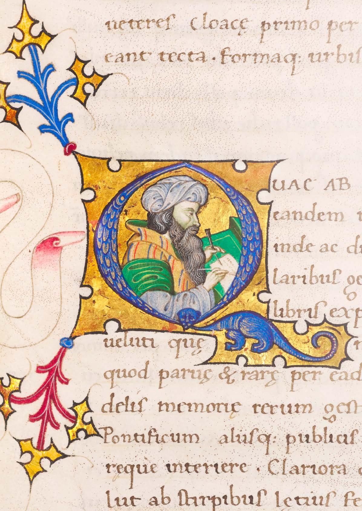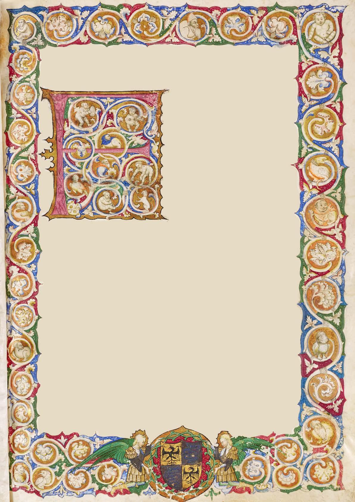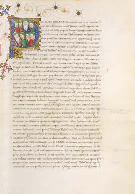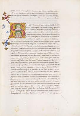 Of particular note is the exceptional state of preservation in which the manuscript has survived. This allows for a full appreciation of its outstanding craftsmanship, and especially of its illuminations, executed in the workshop of the Master of the Vitae imperatorum, one of the leading figures in book production in the Duchy of Milan during the years of Filippo Maria Visconti and the rise of the Sforza dynasty. Two distinct artists can be identified within the decoration, whose styles and visual vocabularies differ markedly: the first, responsible for the inhabited initial and the white-vine border on the incipit page, may be identified with the young Master of Ippolita Sforza; the second, author of the nine historiated initials marking the principal textual divisions throughout the remainder of the volume, is to be identified with the workshop master himself.
