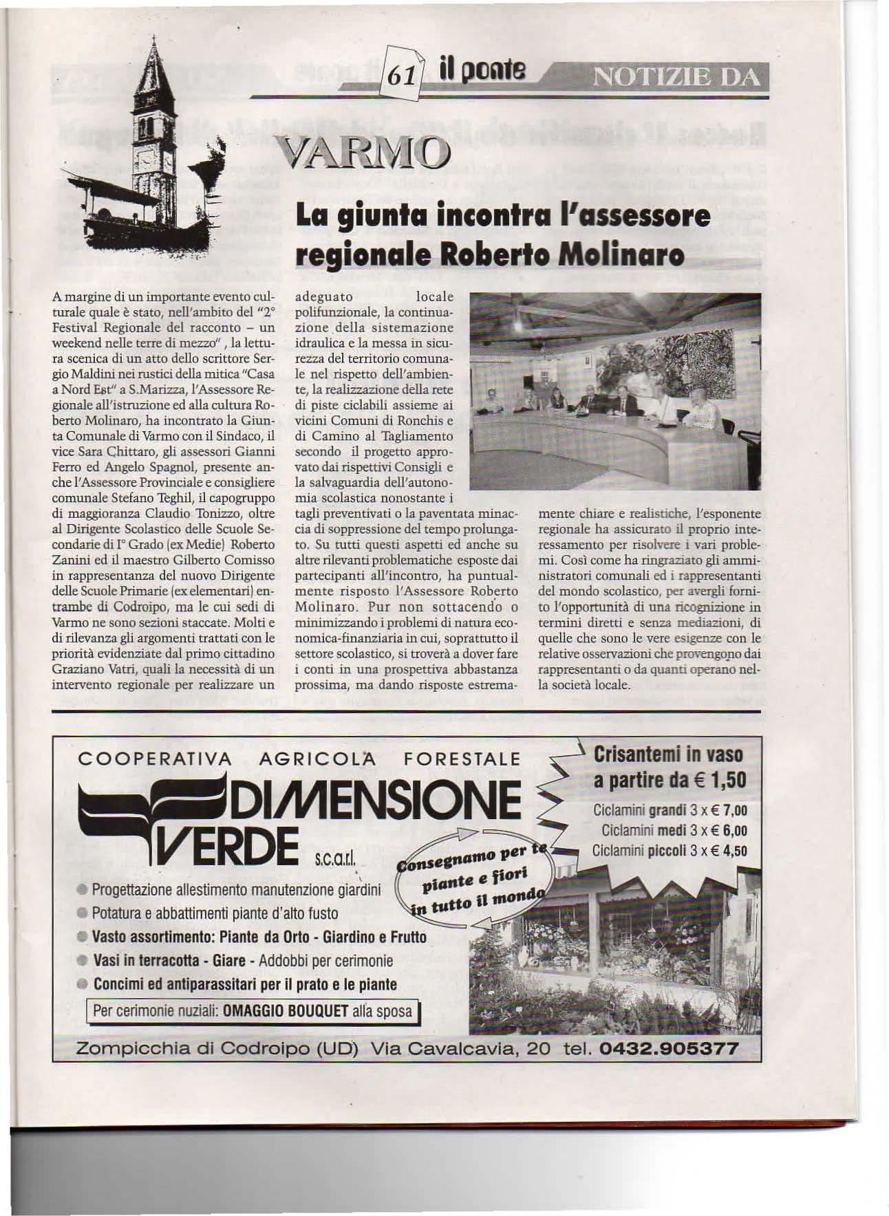 Amargine di un importante evento cultmale quale è stato, nell'ambito del "2° Festival Regional e del racconto - un weekend nelle terre di mezzo", l a lettura scenica di un atto dello scrittore Sergio Mal dini nei rustici della mìtica "Casa a Nord Est" a S.Marizza, l'Assessore Regionale all'istruzione ed alla cul tura Roberto Molinara, h a incontrato la Giu nta C omunale di Varmo con il Sindaco, il vice Sara Chittaro, gli assessori Gianni Ferro ed Angelo Spagnol, presente anc he l 'Assessore Provinciale e consigliere comunale Stefano Thghil, il capogrup po di maggioranza Claudio Tonizzo, o ltre al D irigente Scolastico delle Scuo le Secon darie di e Grado (ex Medie) Roberto Zanini ed il maestro Gilberto Comisso in r appresentanza del n u ovo Dirigente delle Scuole Primarie (ex elementari) e ntrambe di Codroipo, ma le cui sedi di Vanno ne sono sezioni staccate. Molti e di rilevanza gli argom e n ti trattati con l e priorità evi denziate dal primo cittadino Gr aziano Vatri, quali la necessità di un intervento regionale per realizzare un
