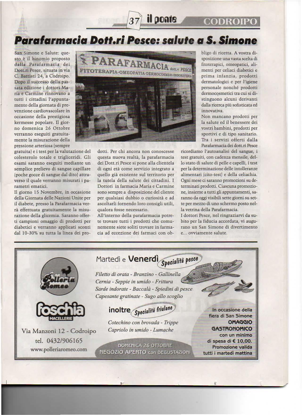 di 108 trecentesche aiiìdare al museo locale pe: tre anni. Naturalmente per gli ultimi due veekend d'ottobre, il cuore della festa sarà ancora piazza Garibaldi, con la presenza del formaggio Moruasio mnrnato a conquistarsi lo scettro regale ddla fiera codroipese. Domeruca 19 una citazione va assegnata ne ufficiale del restaurato campanile del duomo.Per sab ato 25 e domenica 16 l'appuntamento di richiamo sarà costituito dalle iniziative Codro1po incontra l'Europa con scambi culturali e prodotti tipici con Austria, Slovenia e Belgio. li momento saliente della Fiera si avrà domenica 26 ottobre con i negozi aperti e con la presenza delle 200 bancarelle. Scenderà il sipario sulla kermesse marted.l 28 ottobre dopo l'assegnazione del prernio letterario in lingua friulana San Simon e San Simonut rispettivamente 29• e 24•edizione.n testimone passerà quindi al vicino comune di Rivignano , dove da giovedl30 ottobre a domenica 2 novembre, si svolgerà la tradizionale Fiera dei Santi, una manifestazione in continua crescita per proposte ed attrattive.