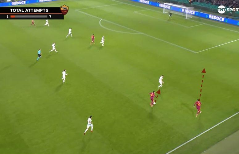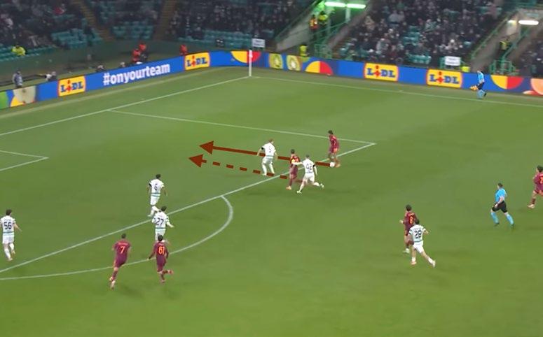 La didattica del due contro uno alla base del raddoppio della Roma 1 In questo caso, dopo l’impostazione di Mancini, è Soulé a smarcarsi dal suo avversario e a condurre il pallone mentre Celik va in sovrapposizione esterna 2 In questi casi qualche giocatore commette l’errore di accentrarsi, invece la cosa più produttiva da fare è correre dritto verso il proprio marcatore e costringerlo a fare una scelta: come si vede, in questo punto il difensore segue Soulé e lui giustamente può servire Celik