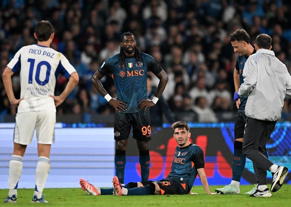 I giocatori attorno a Billy Gilmour dopo l’infortunio dell’1 novembre al Maradona nella sfida contro il Como GETTY IMAGES