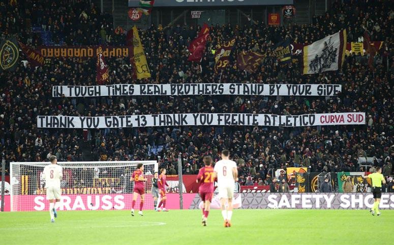 piono e animano parte del settore ospiti. La gara parte, la Sud canta: «E forza Roma facci un gol». Detto fatto, su quelle note El Aynaoui devia al volo in rete il cross di Celik. 1 a 0. Subito dopo parte: «Voglio solo star con te», colonna sonora di un’annata europea meravigliosa, quella del 3 a 0 al Barcellona e della semifinale di Champions. La Curva si riempie dopo un quarto d’ora, quando arriva anche il Gruppo Quadraro, che lascia però la sua “pezza” capovolta. Al 20’, con tutte le bandiere dei gruppi in fila, la Sud ringrazia con uno striscione gli amici del Gate 13 e del Frente Atletico (gruppi organizzati di Panathinaikos e Atletico Madrid) per la vicinanza dimostrata nella vicenda di Nizza. La Roma in campo è una marea che si alza e all’Olimpico si canta: «Sosteniamo la squadra più forte, che il mondo ha visto mai». L’entusiasmo viene smorzato dall’uscita dal campo di Koné per infortunio. Nella ripresa si attacca verso la Sud, che si veste a festa: «Quando al ciel si alzeran le bandiere». A farle sventolare, le bandiere, è anche il primo freddo della stagione all’Olimpico. Gli unici fischi di serata se li becca l’arbitro Dabanovic. Quando El Shaarawy segna il 2 a 0 parte il coro del sogno: «In Curva Sud noi staremo ad aspettar», cantato da tutti. Il 2 a 1 non sortisce effetto, arriva la fine e “Grazie Roma”. Ora testa a domenica, il cuore è lì già da tempo. ■