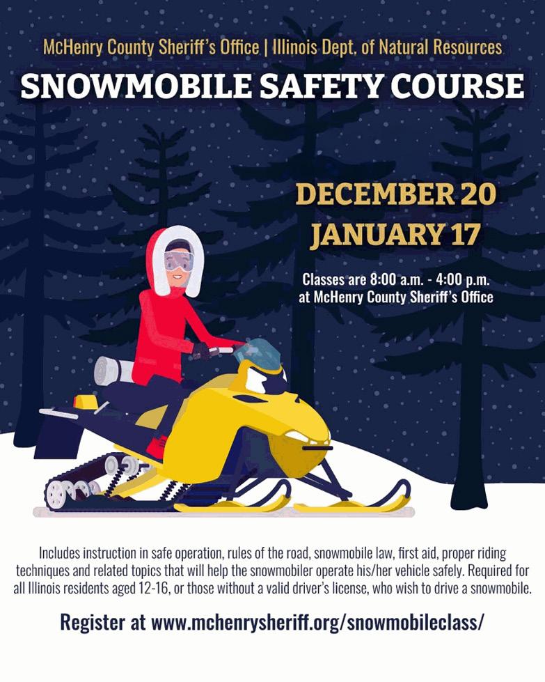 12/20/25 McHenry County Sheriff’s Office 2200 N. Seminary Road, Woodstock 8:00am-4:00pm Register at www.mchenrysheriff.org/snowmobileclass/