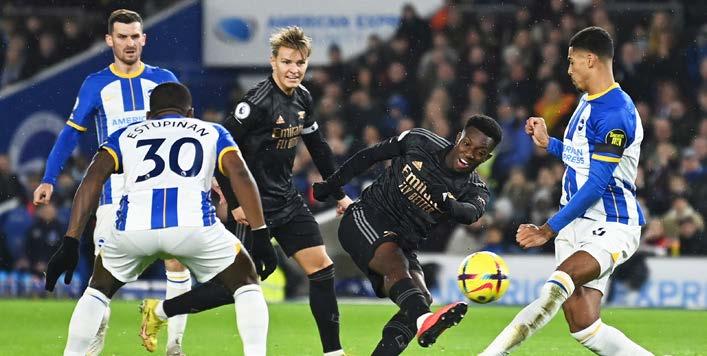 Mikel Arteta’s side powered to a fifth successive league victory thanks to goals from Bukayo Saka, Martin Odegaard, Eddie Nketiah and Gabriel Martinelli on New Year’s Eve at the Amex Stadium.