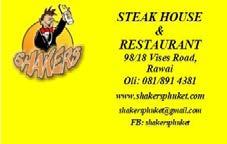 6 PM onwards: All you can eat BBQ buffet cooked to order. Beef, Pork, Chicken, Burgers, Sausages, Fish, Prawns & Squids, salad buffet and veggies, Choice of potatoes, cold and hot sauces, Bread, Buns & garlic bread. We have a kid’s playground zone. Adults: 395 baht P.P. Kids under 12 years old: 195 baht P.P. www.shakersphuket.com www.facebook. com/shakersphuket Oliver, Shakers restaurant 98/18 Vises Road, Rawai 83130, 081 891 4381