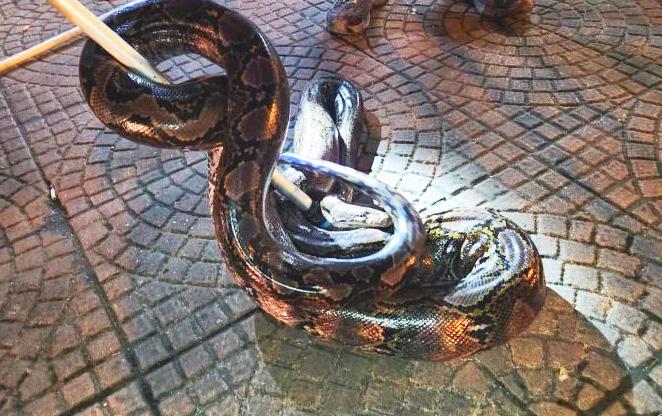 СПАСАТЕЛИ KUSOLDharm Foundation поймали ночью 2 ноября особого крупного питона длиной в 4,5 метра. Местные жи тели обнаружили огром ную змею у отделения Government Saving Bank, находящегося в двух сот нях метров от Памятни ка Героиням на дороге в Паклок. Как рассказал спасатель Нуттапхонг Конгким, ког да специалисты прибыли на место событий, змея пряталась под лотком для торговли курицей с рисом, а собравшиеся вокруг мест ные жители следили за тем, чтобы она никуда не уползла и не спряталась. Пойманного питона измерили, взвесили (в Инфляция замедляется в Таиланде
