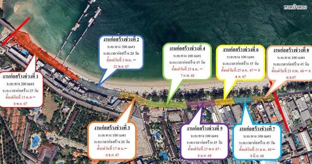 According to the actual construction plans by Patong Municipality, construction will be carried out in eight phases, with Phase 1 starting at the southern end of Patong on Oct 15 and Phase 8 concluding further north on May 8.