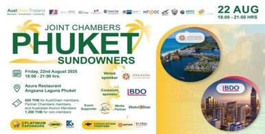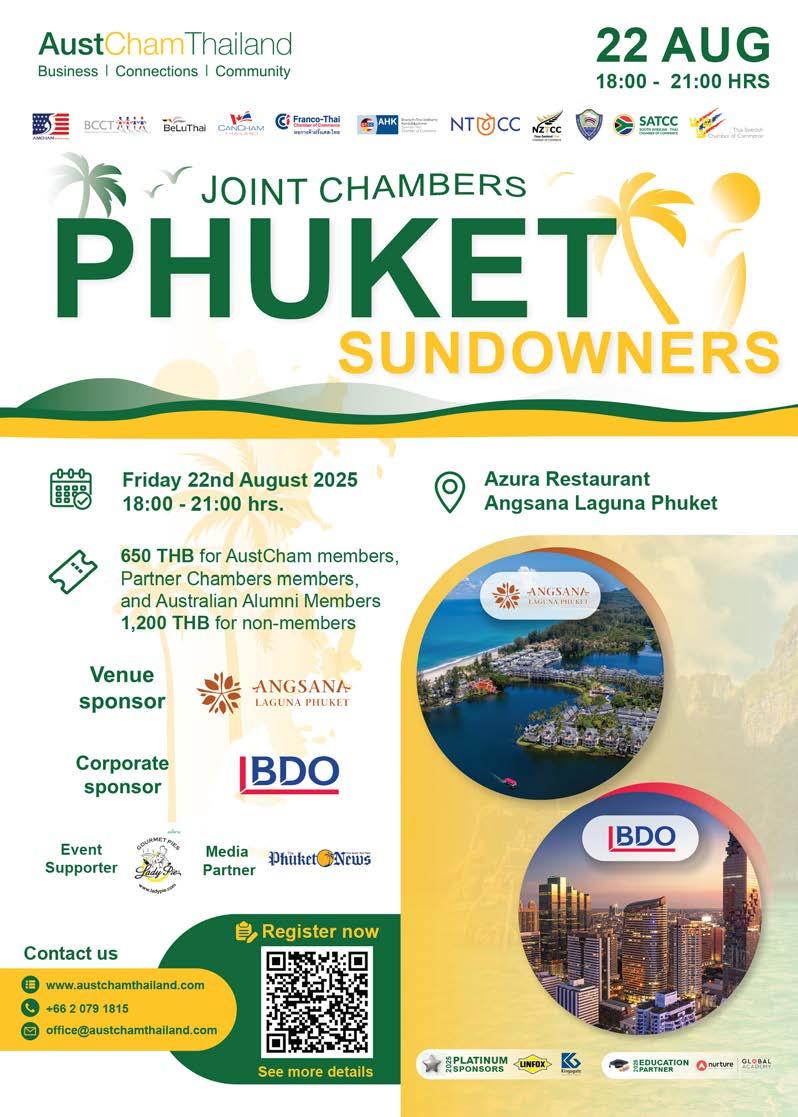 Вечер зарубежных торговых палат под эгидой AustCham Тайско-австралийская торговая палата AustCham Thailand в сотрудничестве Australian Alumni, AMCHAM, BCCT, Belgian-Luxembourg/ Thai Chamber, CanCham Thailand, FTCC, GTCC, NTCC, Phuket Chamber of Commerce и ThaiSwedish Chamber приглашают гостей на вечер торговых палат Joint Chambers Phuket Sundowners с 18.00 до 21.00