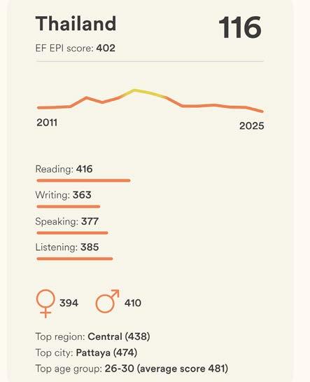 Index 2025, где страна заняла 116-е место из 123 возможных. Королевство набрало 402 балла, что на 13 пунктов меньше показателей прошлого года. Отчет с результатами тестирования был опубликован в конце декабря на официальном сайте индекса ef.com – и предсказуемо не порадовал Министерство образования Таиланда.