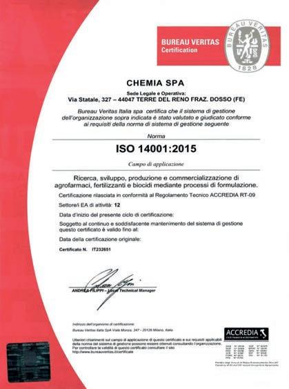 CHEMIA è in possesso delle certificazioni ISO 14001 e ISO 9001 a garanzia del fatto che le attività di ricerca, sviluppo, produzione e commercializzazione degli agrofarmaci sono sottoposte ad accurati controlli.