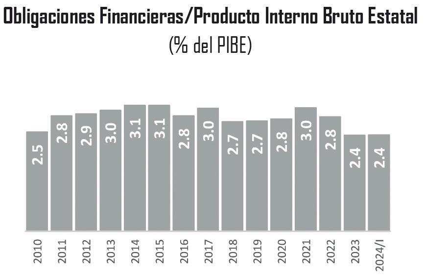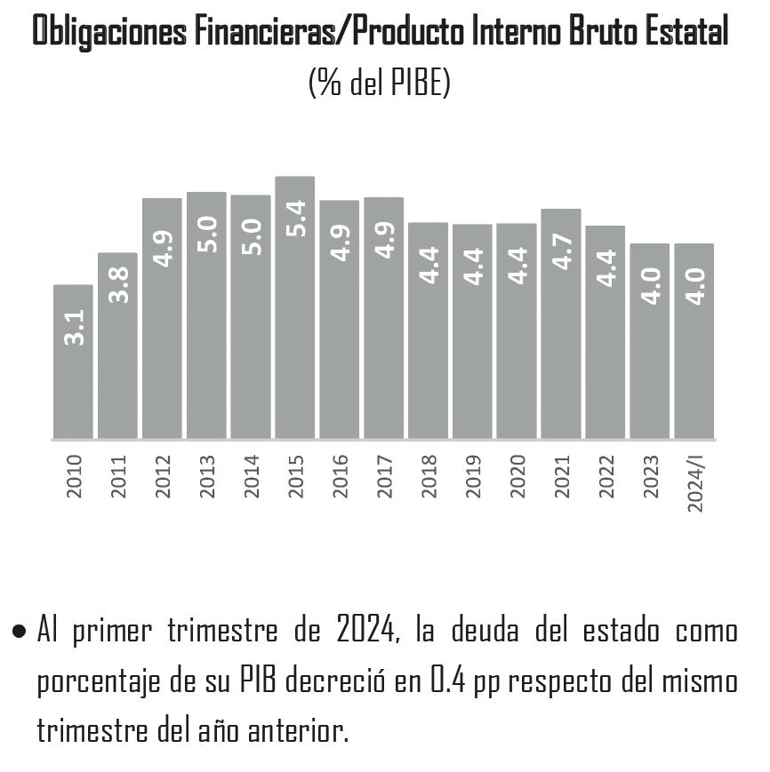 Al primer trimestre de 2024, la deuda del estado aumentó en 6.5% en comparación con el mismo trimestre del año anterior, sin embargo, disminuyó en 0.2% en relación con el último trimestre de 2023.