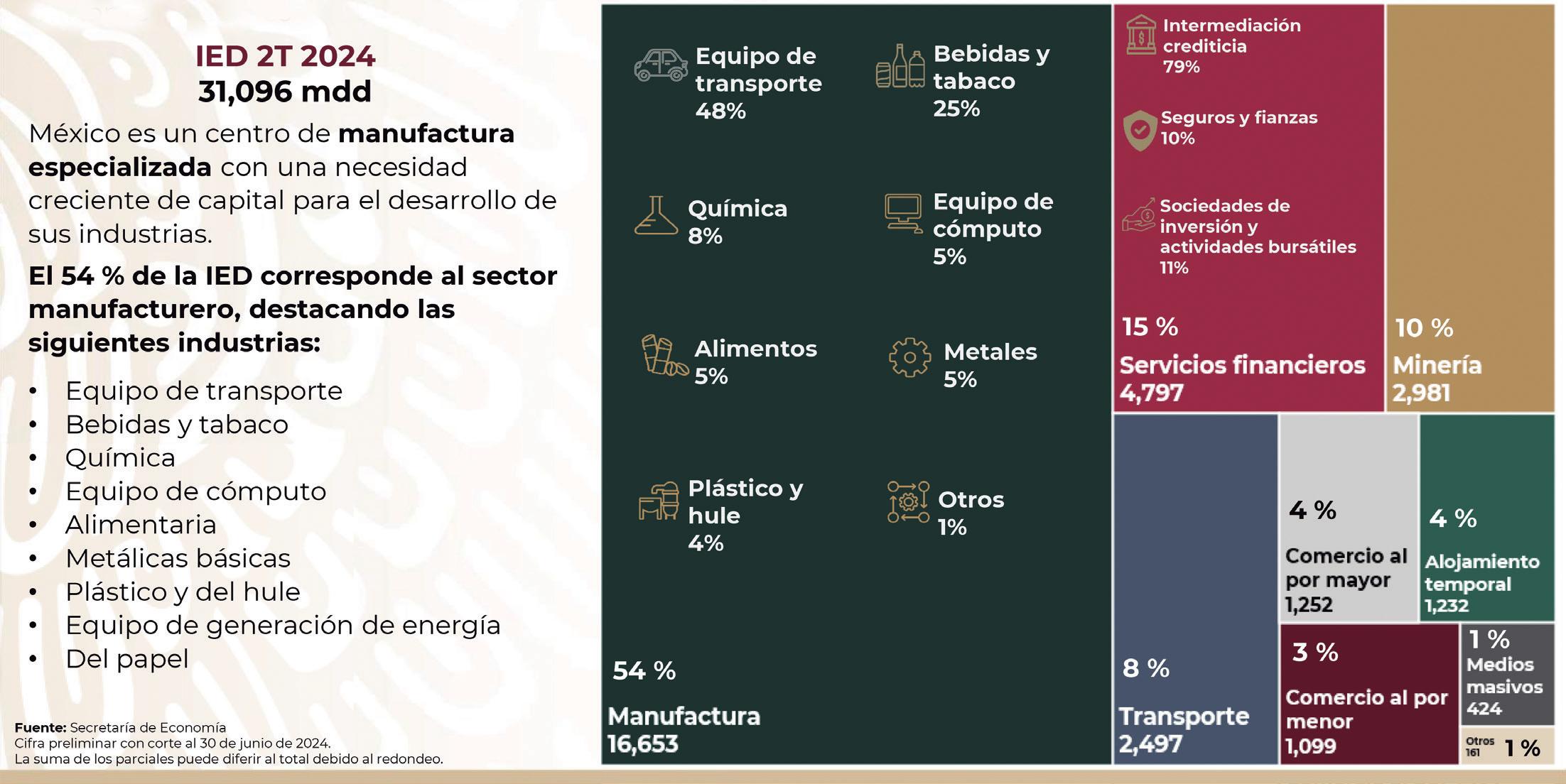 Al segundo trimestre de 2024, México registró un IED por 31 mil 096 millones de dólares, 7 por ciento mayor en comparación con la reportada para el mismo periodo de 2023.