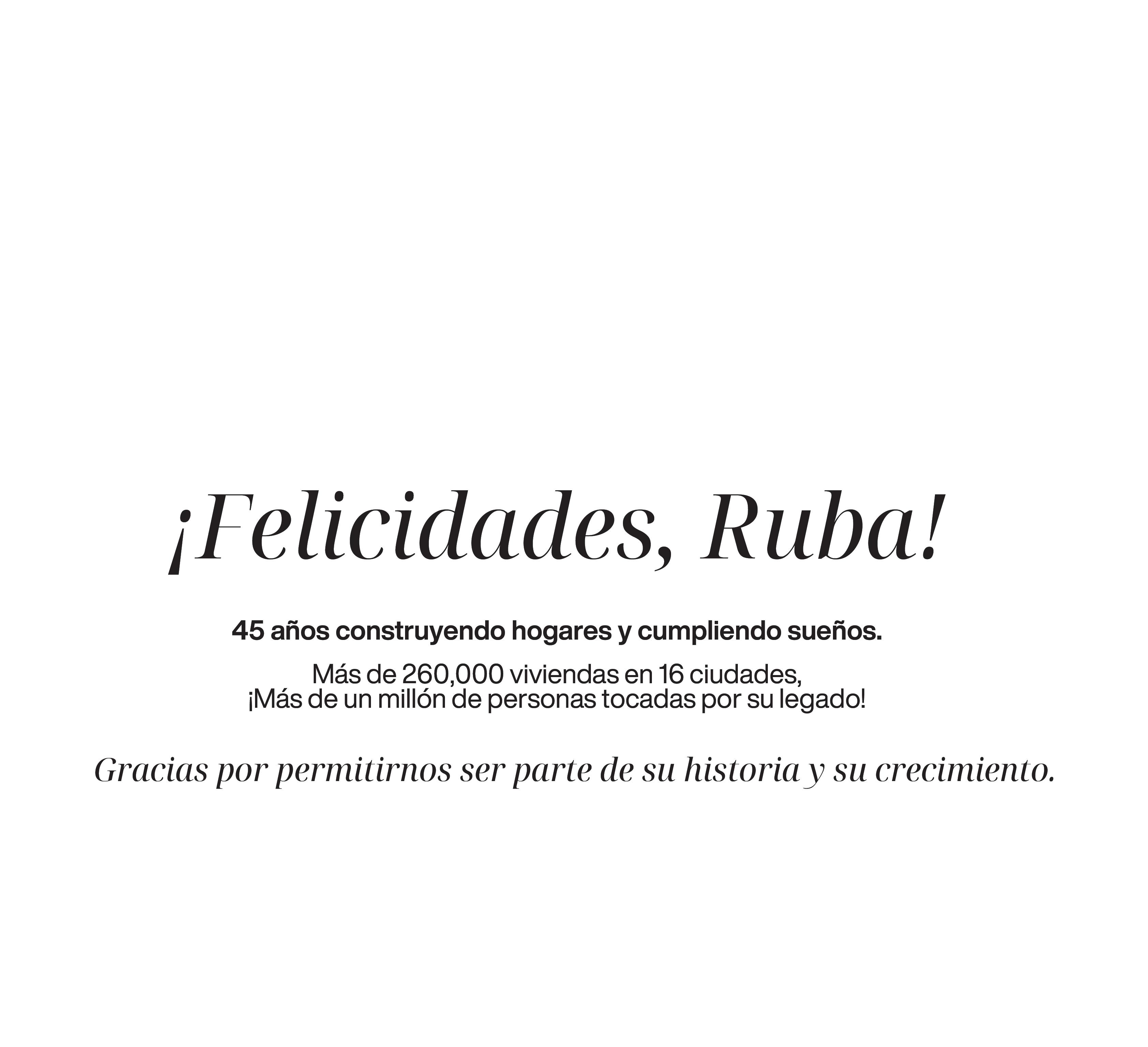 Ruba, gracias por permitirnos ser parte de su historia. En Grupo Constructor Tolmar celebramos su legado y nos llena de orgullo seguir construyendo juntos.