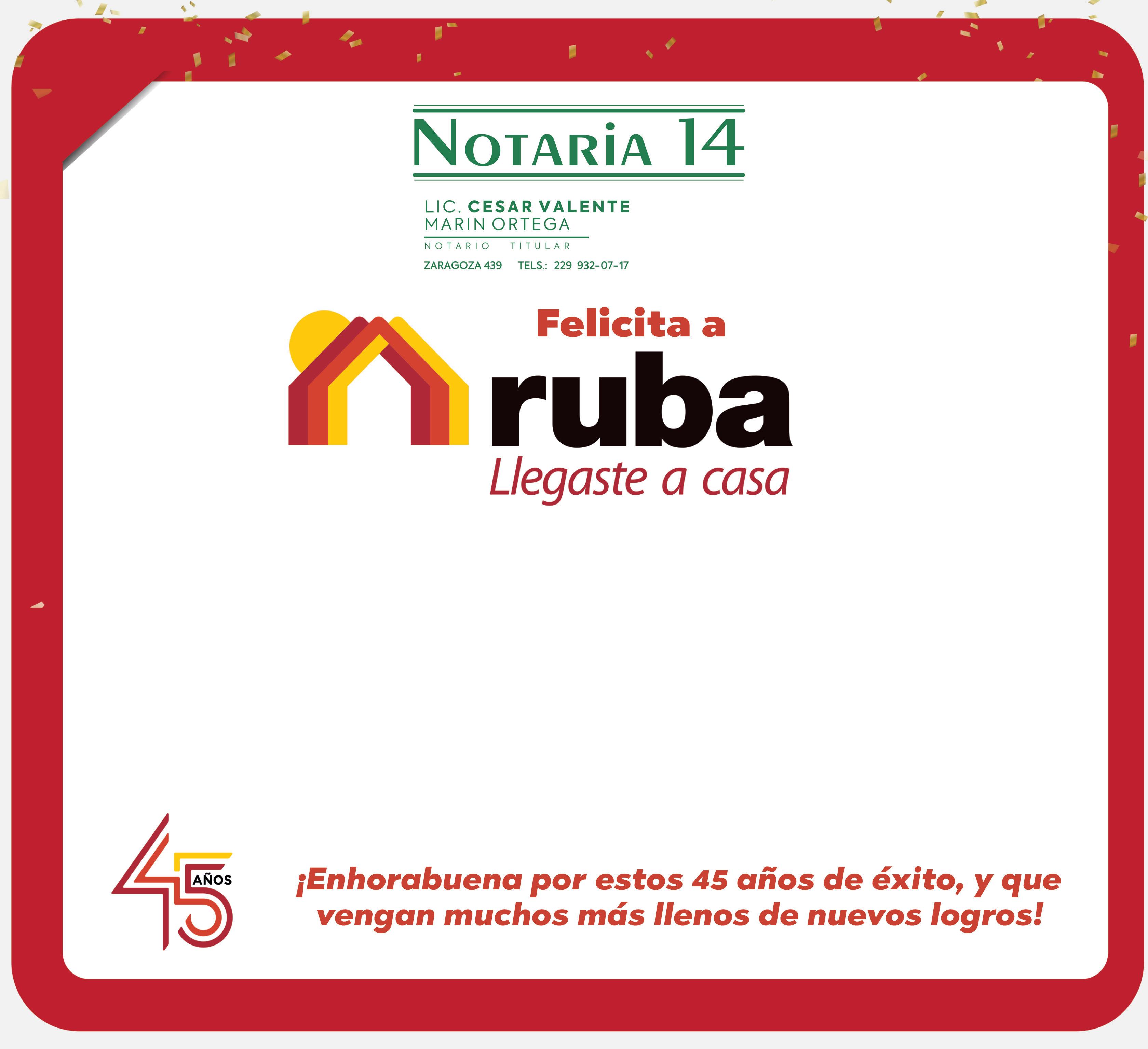 Felicitamos a Ruba Desarrollos por 45 años de trayectoria ejemplar. Desde nuestra labor como NOTARÍA PÚBLICA, agradecemos profundamente la confianza que han depositado en nosotros a lo largo del tiempo.
