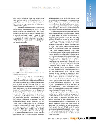 por evaporación de la superficie anterior de la córnea (desde la tasa de base normal de 3 microlitro/hr cm2 hasta un máximo de 40 microlitro/ hr cm2). En otro ejemplo, la pérdida de la capa acuosa, que es producida por las glándulas lagrimales, da lugar a la condición de enfermedad del ojo seco por deficiencia de lágrimas acuosas. El epitelio corneal está en un estado de constante renovación, ya que las células escamosas más superficiales se vierten continuamente en la película lagrimal. Se estima que las capas celulares del epitelio corneal se renuevan cada 7-10 días. La superficie epitelial es mantenida por las células epiteliales basales, que normalmente pueden sufrir una mitosis una vez, lo que da lugar a dos células hijas que se encuentran antes de la capa de células basales, dando lugar a dos células alares y finalmente a dos células escamosas. Un delicado equilibrio de desprendimiento seguido de proliferación es fundamental para mantener una superficie epitelial lisa y uniforme. El paso de desprendimiento es inducido principalmente por la fricción que se produce por el parpadeo involuntario o voluntario de los párpados, que se produce en promedio cada 7 segundos o 6-15 veces por minuto. La señal para la proliferación de células epiteliales basales viene probablemente a través de las uniones tipo gap, especialmente en la capa de células basales, ya que expresan la proteína de unión tipo gap. Además de la mitosis de las células epiteliales basales (proliferación vertical), el epitelio corneal se mantiene por la migración de nuevas células epiteliales basales hacia la córnea desde el limbo (proliferación horizontal). Las células migran centrípetamente a una velocidad de aproximadamente 120 micro-m/semana y se originan en una subpoblación de células epiteliales progenitoras proliferativas del limbo. Parece que el epitelio corneal se mantiene gracias a un equilibrio entre los procesos de proliferación horizontal y migración de las células del limbo, la migración horizontal de las células epiteliales de la córnea basal y la proliferación terminal vertical, y la eliminación de las células epiteliales escamosas superficiales de la córnea. Este concepto ha sido acuñado por Thoft como la hipótesis X, Y, Z, donde X= proliferación de células epiteliales de la córnea basal; Y= proliferación de células del limbo; Z= pérdida de células epiteliales en la superficie anterior por el parpadeo. AÑO 22 • VOL. 22 • MAY-JUN • MÉXICO 2020
