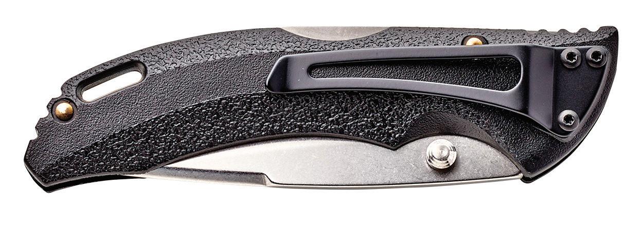 Stylish, contoured black handle with textured surface for added grip. Features thumb studs for easy opening and closing. Stainless steel pocket clip that can be removed for easy carry. 4.35” handle. 3.15” blade. Laser engraved on blade. Min. 24