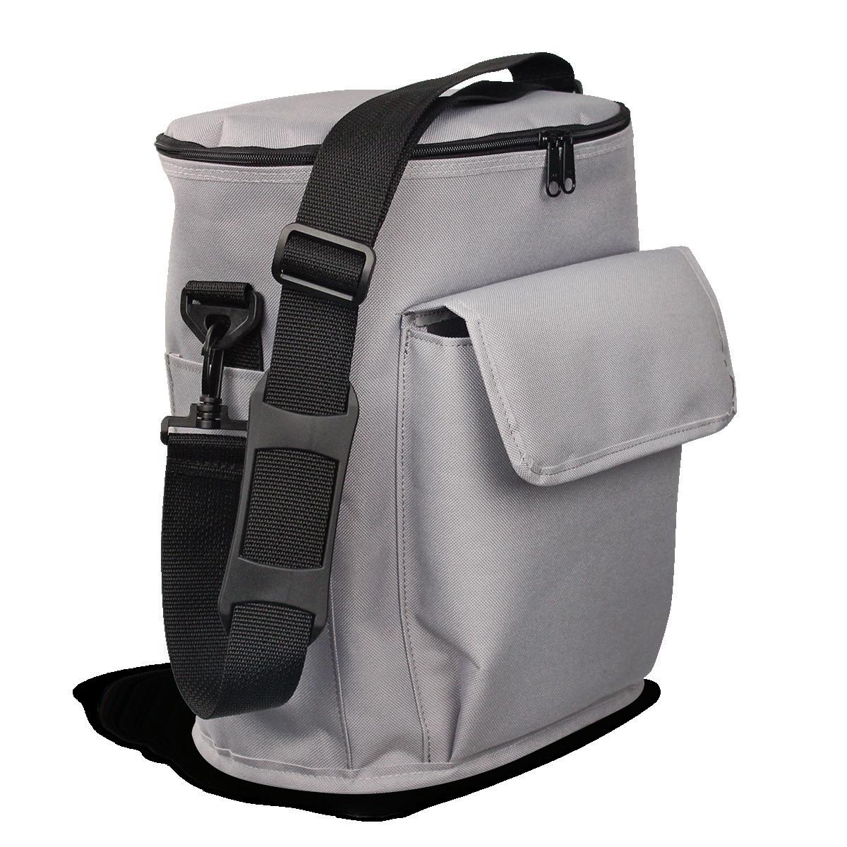 Denier Polyester w/ white vinyl lining inside. Heat sealed/ leak proof inside lining, mesh water bottle pocket on side. Insulated front pocket w/ shoulder strap. Min. 100