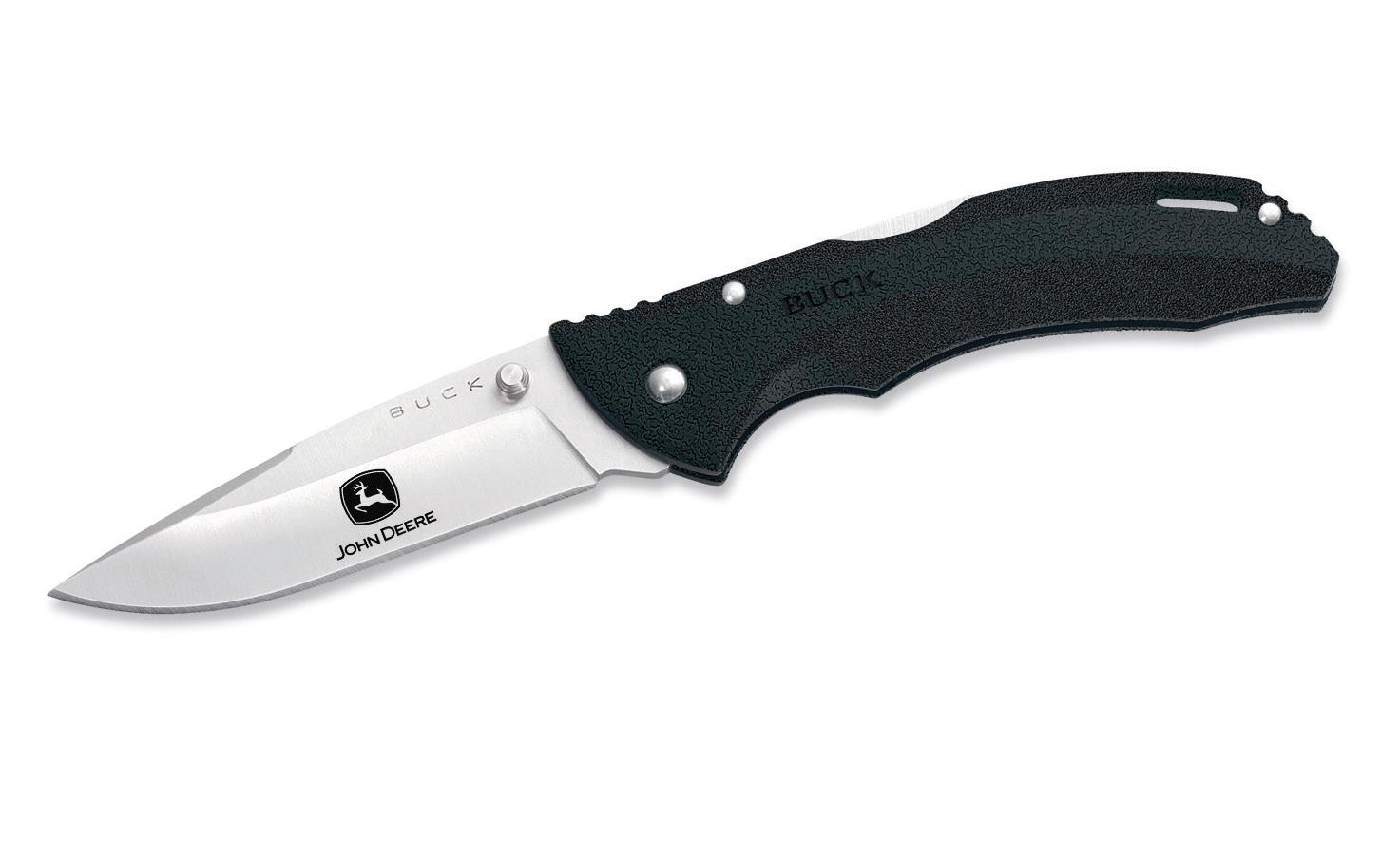 Stylish, contoured black handle with textured surface for added grip. Features thumb studs for easy opening and closing. Stainless steel pocket clip that can be removed for easy carry. 4.35” handle. 3.15” blade. Laser engraved on blade. Min. 24