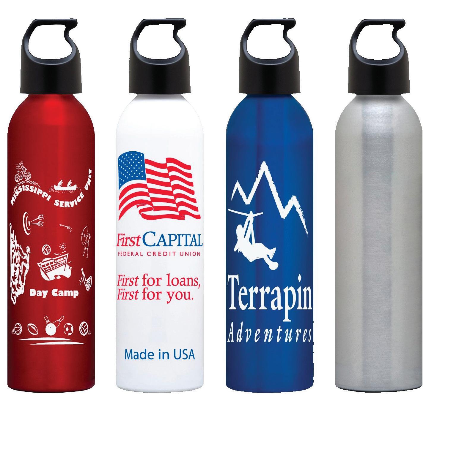 Union Made 24 oz Aluminum Bottle. BPA free and spill proof black lid. Min. 50