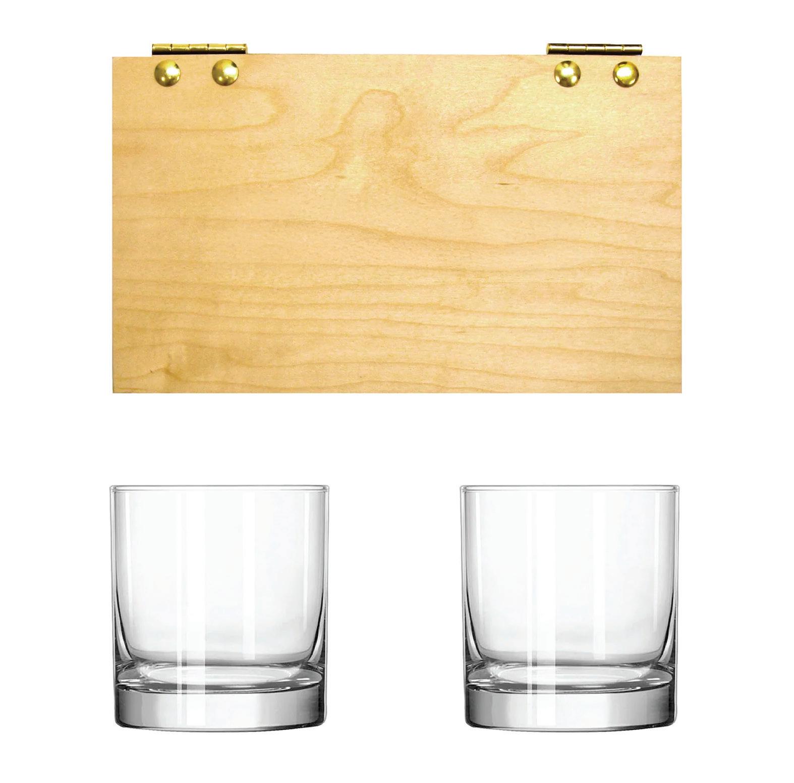 Crafted for true spirits enthusiasts, this elegant gift set features two rocks glasses housed in a handcrafted maple wood box. Both the lid and glasses can be personalized, making it a timeless gift for any occasion. 5.5” x 9.25” x 4.75” (W/H/D). Min. 100